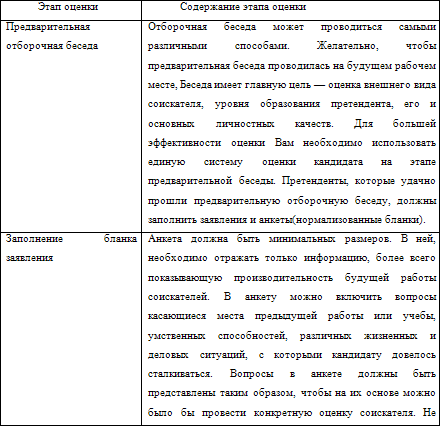 Во второй главе рассмотрим традиционные методы оценки персонала применяемые в настоящее время в большинстве российских компаний. Практика деятельности крыпных компаний показывает, что до вынесения Вами решения о найме на работу кандидат должен пройти несколько этапов оценки: предварительную отборочную беседу; заполнение бланка заявления; интервью; тестирование; проверку рекомендаций и послужного списка; медицинский осмотр; принятие решения. Контрольная таблица: Содержание этапов оценки персонала ![]() ![]() ![]() Пример: Проведенные маркетинговые исследования в сфере оценки персонала свидетельствуют о том, что более 90 процентов всех решений по найму соискателей фирмами США основываются на результатах интервьюирования кандидатов. При оценке персонала Вы имеете право требовать от соискателя документы, которые дают нужную информацию о нем. В соответствии с трудовым законодательством запрещается требовать от работника документы не предусмотренные законодательством. В настоящее время компании имеют право предопределять перечень документов, которые необходимы для найма на работу в компанию. В качестве рекомендации требуйте от соискателя характеристики с прежнего места работы и образовательного учреждения. Этот момент будет способствовать ответственности к будущей работе и учебе. Пример: Использование характеристик с последнего места работы и учебы имеет широкое распространение во многих странах Европы. Например в немецких компаниях обязательно представление сотруднику рекомендаций. По своей сути рекомендация это та же характеристика. Для большей объективности организациям запрещено указывать в них недостатки работника. Но исследование части рекомендаций позволяет говорить об косвенных указаниях на недостатки сотрудника, которые были отмечены в ходе его трудовой деятельности в компании. На заметку: В листок по учету кадров можно внести такие вопросы, как: общественно-полезная деятельность; навыки и умения, не касающиеся профессиональной деятельности; увлечения профессионального уровня; когда кандидат на вакансию может приступить к работе (время). Иногда некоторые компания используют немного другой вид документа. Это резюме-справка, которая характеризует кандидата. Контрольная таблица: Характеристика основных методов, применяемых при оценке персонала ![]() Контрольная таблица: Итоговые результаты процедуры отбора персонала ![]() На заметку: При заключении трудового договора лицо, поступающее на работу, предъявляет работодателю: паспорт или иной документ, удостоверяющий личность; трудовую книжку, за исключением случаев, когда трудовой договор заключается впервые или работник поступает на работу на условиях совместительства; страховое свидетельство государственного пенсионного страхования; документы воинского учета – для военнообязанных и лиц, подлежащих призыву на военную службу; документ об образовании, о квалификации или наличии специальных знаний – при поступлении на работу, требующую специальных знаний или специальной подготовки. При заключении трудового договора впервые трудовая книжка и страховое свидетельство государственного пенсионного страхования оформляются работодателем. Анализ резюме