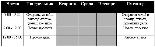 Часть третья. ПЛАНИРОВАНИЕ5. Планирование времениСоздание гармонии и равновесия в жизни У каждого из нас очень много дел, которые мы хотим сделать, и нам бывает очень тяжело найти достаточно времени. Не кажется ли вам, что одна из областей вашей жизни преобладает над другими, поглощая все ваше время, вынуждая вас пренебрегать остальными жизненно важными областями жизни? Достичь равновесия и гармонии в жизни означает распределить свое время в правильных для вас соотношениях. Чтобы быть уверенным, что вы выделили достаточно времени для тех видов деятельности, которые направлены на достижение ваших личных стратегических целей, вам нужно составить схему или план распределения времени, то есть образец, шаблон расписания, который поможет вам добиться идеального для вас равновесия между различными видами деятельности. План распределения времени — это просто наглядная, схема, отражающая ваш ежедневный, еженедельный и ежемесячный график жизни. Но это также и могущественный инструмент, помогающий вам оставаться проактивными[2] в водовороте задач и проблем, которые встают на вашем пути. Вместо того чтобы считать, что вы должны действовать, немедленно откликаясь на все возникающие пред вами вопросы и требования, вы можете взглянуть на план распределения времени, определить, когда у вас появится время для этой неожиданно возникшей задачи, и либо запланировать ее выполнение, либо пропустить ее. «Детсадовская» модель организации пространства. В своей первой книге «Самоорганизация по принципу «изнутри наружу» я описала концепцию использования классной комнаты детского сада в качестве идеальной модели для организации любого пространства. Детский сад как идеальная модель организации пространства Причина, почему классная комната детского сада функционирует настолько успешно, заключается в том, что она разделена на четко определенные зоны деятельности, чтобы дети могли сосредоточиться в нужный момент на чем-то одном. В ней есть уголок для чтения, зона для занятий рисованием, лепкой и другими видами прикладного искусства, музыкальный уголок и зона для переодевания. Все вещи имеют четко определенное место расположения, поэтому всегда найдется только одно логически обоснованное место, где можно найти определенную вещь и куда можно снова положить ее. Легко понять, как можно применить этот принцип к любому физическому пространству, будь это ваша кухня или ваш офис, но как это можно применить к управлению временем? Зоны деятельности вашего расписания включают в себя все родственные или связанные задачи: например, чтение и сортировку корреспонденции, электронной почты и телефонные звонки. Точно так же, как для вашей обуви отведено определенное место в шкафу, для всех задач должно быть отведено определенное место в вашем расписании. Когда вы устанавливаете обособленные зоны для каждого рода деятельности, это также предотвращает смешивание разнородных задач и перетекание задач из одной временной зоны в другую, что подрывало бы вашу способность концентрации и мешало бы вам наслаждаться текущим делом. Скажем, сейчас — вечер вторника, и вы играете в «Монополию» со своими детьми. Когда ваша фишка попадает на Парк Плэйс и ваша дочь говорит вам: «Плати», вы вдруг вспоминаете, что у вас есть настоящие счета, которые вам нужно оплатить. Вме