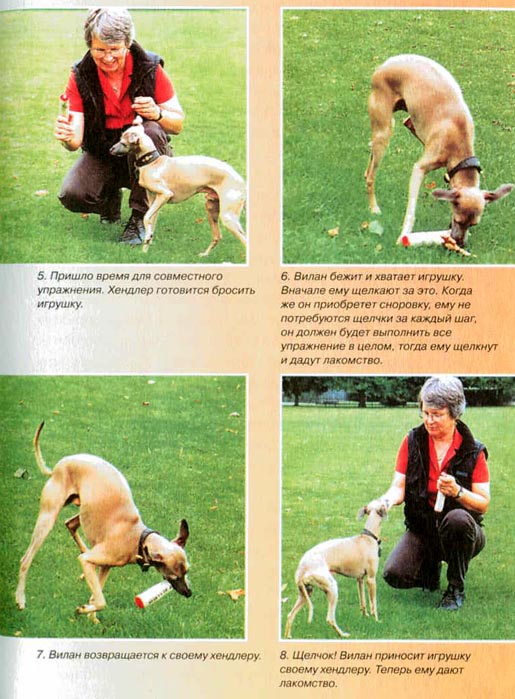 ГЛАВА ЧЕТВЁРТАЯНЮАНСЫ ДРЕССИРОВКИ С КЛИКЕРОМ Легко выполнимые советы для начинающих дрессировщиков с кликером ![]() Если вы уже отработали действия, описанные в главе «Давайте начнём», то эта информация может быть для вас обзором основных ошибок, которые совершают начинающие дрессировщики с кликером. Вначале щёлкайте, а потом давайте лакомство При такой дрессировке вам не нужно держать лакомство перед собакой, приманивать или соблазнять её. Что делает ваша собака в момент получения лакомства вовсе не важно. Ваше животное помнит, что оно делало, когда услышало щелчок. После щелчка можно позволить собаке прекратить действие, дать лакомство, а затем вернуться к дрессировке, и это не вызовет никаких проблем. Всегда щёлкайте, когда у собаки получается нужное действие Щелчок является акустическим указателем, он прямо поступает в нервную систему животного и несёт сообщение: «То, что сейчас делает твоё тело, будет оплачено». Поэтому использовать его нужно очень точно. Если вы, к примеру, учите собаку прыгать, нельзя щёлкать, когда собака собирается прыгнуть, нельзя щёлкать после завершения прыжка, нельзя щёлкать, когда вы думаете, что собака сейчас прыгнет. Нужно щёлкать, когда собака находится в воздухе. Когда собака уже научилась прыгать, вы можете улучшить её приземление, щёлкая, если она приземлилась правильно. Пищу дают позже, сообщение несёт щелчок. Щёлкают только один раз Избегайте множественных щелчков, особенно за хорошее поведение. Момент щелчка имеет решающее значение, этим щелчком вы точно скажете собаке, что вам нравится. Если вы будете щёлкать снова и снова, животное не сможет понять, какой щелчок имеет значение, и поведение не улучшится. Более того, собака может решить, что сигналом являются множественные щелчки. ВЫБОР ПРАВИЛЬНОГО МОМЕНТА ДЛЯ ЩЕЛЧКА ![]() Чейза учат стоять в выставочной стойке. Ему щёлкают за позу, и он знает, что после дадут лакомство. Лови! Чейза вознаграждают лакомством. Не щёлкайте, чтобы привлечь внимание собаки или заставить собаку подойти к вам Будьте уверены, вы будете использовать кликер для этих целей, хотя бы вначале. Если у вас были такие трудности в прошлом, то новая реакция, подкрепляемая вами, заставит вас пытаться повторить её снова и снова. Будьте бдительны к себе! Если вы продолжаете подзывать собаку к себе при помощи кликера или пытаетесь щелчками отвлечь собаку от интересных ей вещей, то вы потеряете всю информативную для собаки силу кликера. Не используйте кликер для побуждения или как начальный сигнал Вы всегда должны думать: «Что я по-настоящему подкрепляю?» Если ваша собака колеблется или отстаёт, а вы щёлкаете, чтобы её подбодрить, то вы подкрепляете её сомнения и отставание. Щёлкайте только на поведение, которое вам нужно. Используйте лакомство правильного размера и типа Здесь приведён ряд здравых правил относительно лакомства:— Начинайте дрессировку с голодным животным. Большинство дрессировщиков с кликером делают короткий пятиминутный урок прямо перед кормлением собаки. — Не оставляйте пищу в миске на целый день, кормите животное в строго определённое время. Если вам приходится оставлять пищу для животного (по рекомендации ветеринара для большинства мелких птиц и мелких животных), то убирайте пищу на два или три часа перед дрессировкой. — Сделайте лакомство частью общег