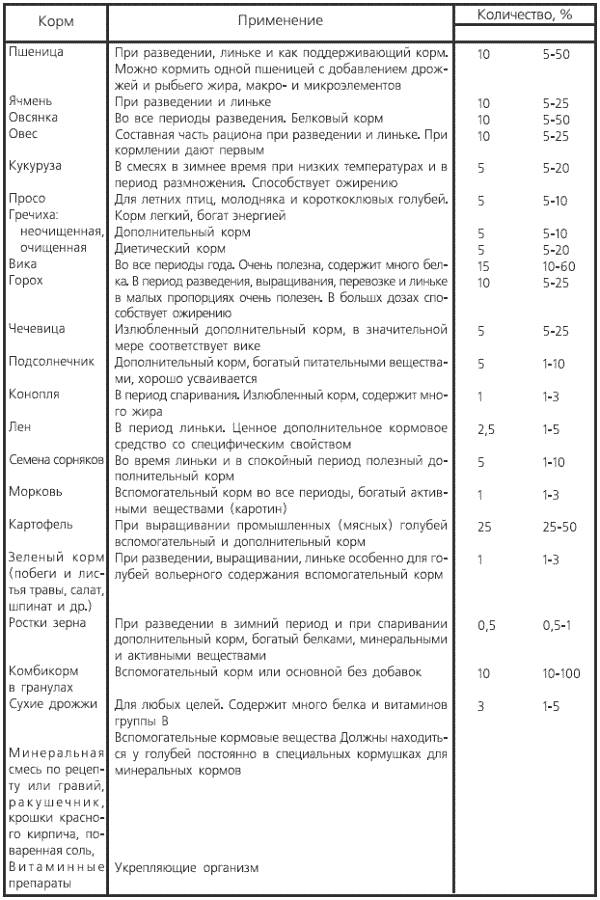 ПИТАНИЕ ГОЛУБЕЙС питанием голубей обычно не возникает проблем. Но при ближайшем рассмотрении этого вопроса можно отметить несколько тонкостей. В первую очередь домашние голуби питаются различными зернами. Огромное количество голубей кормится различными смесями зерновых и бобовых культур. Однако подобное питание содержит недостаточно полезных для голубей веществ, и необходимо дополнение к такому корму. Десятилетиями кормовые средства исследуются по нижеприведенной схеме. Корма и их исследованиеВсе корма содержат довольно много воды (зерновые, например, – 8-14 %). Это процентное соотношение было установлено путем многочасового высушивания измельченной и точно взвешенной пробной дозы корма при температуре 105 °C в специальном контейнере и сравнения веса корма до и после высушивания. «Сырым остатком» называют вещества, которые после 90-минутного высушивания при температуре 600 °C все еще остаются в этой пробной дозе. К этим остаткам относятся минеральные вещества из растений и примеси в них. При таком высушивании устанавливается также и доля случайно попавшего в корм песка. К белку в чистом виде относится группа азотсодержащих составляющих корма, которая на практике называется протеином. Для определения их доли берется проба корма и полученное количество вещества умножается на фактор 6,25, так как большинство кормов содержат около 16 % азотных составляющих. В разных кормах количество белка в чистом виде может сильно отличаться друг от друга. Зерновые культуры содержат обычно 9-14 %, а бобовые – 22–34 % белка в чистом виде. Понятием «жир в чистом виде» обозначают жиры и жиросодержащие субстанции, которые после многочасового извлечения расщепляются в этиловом эфире. При таком процессе выявляются также и прочие субстанции, как, например, различные смолы или воск. Клетчатка в чистом виде состоит из субстанций, которые не растворяются при варении в кислоте или щелочи. Здесь идет речь о «каркасных» субстанциях, которые у зерновых культур находятся обычно во внешней оболочке. В корме для голубей содержание клетчатки в чистом виде обычно очень низкое. Группа извлеченных веществ, не содержащих азота, включает особенно важные для корма составляющие – крахмал и сахар. К этой группе относятся также переработанные внутренние вещества целлюлоза и пентозан. Количество извлеченных веществ, не содержащих азота, рассчитывается как пропорция к ста суммы прочих других выявленных веществ. Значение внутренних веществВода Вода – одна из главных составляющих рациона питания голубей. Все самые важные процессы, связанные с пищеварением и обменом веществ, происходят в организме голубя только благодаря присутствию большого количества воды. Она составляет более 50 % массы тела голубя. Например, мышечное мясо содержит около 25 % белка, 1 % минеральных веществ, 2 % жира и около 72 % воды. Несколько часов лишения воды вызывают у голубя жажду, а у быстрорастущих птенцов приводит даже к замедлению роста. Без пищи голубь способен прожить около двух недель, а без воды с трудом сможет продержаться лишь несколько дней. Свежая питьевая вода в чистой емкости всегда должна находиться в распоряжении голубей. Многие заводчики добавляют в питьевую воду специальные дезинфекционные вещества, предотвращающие передачу через воду инфекций и вирусов, – раствор йода или 4 %-