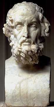 Поэт Гомер. Время его жизни определяют на XII–VIII века до н. э. Полагают, что когда в V веке до н. э. решили сделать его портрет, представления о его внешности ни у кого не было. О слепоте поэта сделали заключение лишь на основе образа «слепого человека из Хиоса» в гимне Аполлону и слепого певца Демодока в «Одиссее». Римская копия с греческого оригинала, созданного приблизительно в 150 до н. э… Лувр. Место рождения Гомера не определено. Внешность его сомнительна. Слепота не подтверждена ничем. В III веке до н. э., линия № 7 (XV реальный век), в то же время, когда Гемист Плетон «возрождает» античную религию в христианской Европе, имя Гомера в «античной» Греции буквально на грани обожествления. Его поэзия стала чем-то большим, чем просто литературой. Т. Синко пишет, невольно рассказывая нам о разделении светской и церковной литературы средневековья: