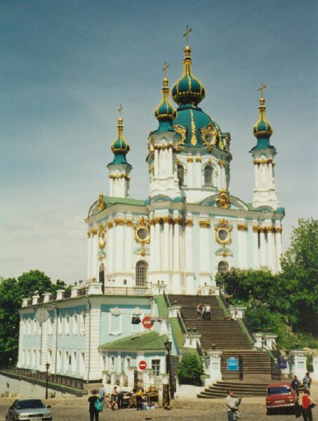 Этот флаг был впервые введен на русском флоте в 1699 году указом Петра Первого. Со...Этот флаг был впервые введен на русском флоте в 1699 году указом Петра Первого. Современный российский военно-морской флот также плавает по морям — по океанам под этим же боевым Андреевским флагом. И сегодня память об Андрее Первозванном жива в церковной традиции и в народе. В Москве, под патронажем олигарха-железнодородника В.Якунина, организован специальный «Фонд Андрея Первозванного», который проводит самые крупные акции для РПЦ. Среди них — доставка в Россию «Стопы Андрея Первозванного», то есть мумифицированной части ноги апостола, одной из особо почитаемых христианских святынь. Надо полагать, верующие поклоняются этой священной реликвии, молятся ей, и она им помогает… Действуют и церкви, воздвигнутые в его честь. Так, в Киеве, месте, которое по легенде посетил в 1 веке н. э. святой Андрей, есть Церковь Андрея Первозванного, посещаемая верующими, паломниками и туристами со всего мира. Рис. 22. Церковь Андрея Первозванного в Киеве |