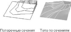 Системная переменная DELOBJ определяет, должны ли контур и траектория удаляться автоматически после построения тела или поверхности, или должен выдаваться запрос на удаление контура и траектории. См. также: ■ Построение спиралей Создание тела или поверхности посредством сдвига объекта вдоль траектории 1. Выберите меню Рисование→Моделирование→Сдвиг 2. Выберите объекты для сдвига. 3. Нажмите клавишу ENTER. 4. Выберите траекторию сдвига. По завершении сдвига исходные объекты удаляются или сохраняются, в зависимости от значения системной переменной DELOBJ. Моделирование СДВИГ Панель "3D построения", "Сдвиг" Краткий справочникКоманды СДВИГ Создание 3D тела или поверхности посредством сдвига 2D кривой вдоль траектории Системные переменные DELOBJ SURFU Задает плотность поверхности для параметра "Сглаживание" команды ПОЛРЕД в направлении M и плотность изолиний U на объектах поверхности SURFV Задает плотность поверхности для параметра "Сглаживание" команды ПОЛРЕД в направлении N и плотность изолиний V на объектах поверхности. Утилиты Нет Ключевые слова для команд Нет Создание тела или поверхности с помощью сеченийС помощью команды ПОСЕЧЕНИЯМ выполняется построение 3D тела или поверхности посредством сечения (рисования тела или поверхности) с использованием двух или более кривых поперечного сечения. Поперечные сечения определяют контур (форму) результирующего тела или поверхности. Поперечные сечения (в общем случае, кривые и линии) могут быть разомкнутыми (например, дуга) или замкнутыми (например, окружность). Команда ПОСЕЧЕНИЯМ изображает тела или поверхности в пространстве между поперечными сечениями. При использовании команды ПОСЕЧЕНИЯМ необходимо задать не менее двух поперечных сечений. Если при построении используется набор замкнутых кривых поперечных сечений, получается тело. Если при построении используется набор разомкнутых кривых поперечных сечений, получается поверхность.
