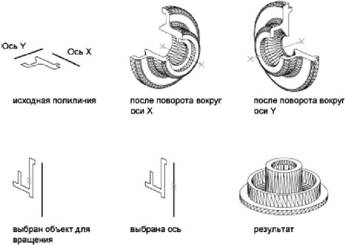 Системная переменная DELOBJ определяет, должны ли поперечные сечения, траектории и направляющие удаляться автоматически после построения тела или поверхности, или должен выдаваться запрос на удаление контуров и траектории. Создание тела или поверхности по сечениям с использованием набора поперечных сечений 1. Выберите меню Рисование→Моделирование→По сечениям 2. Выберите поперечные сечения в том порядке, в котором тело или поверхность должны через них проходить. 3. Нажмите клавишу ENTER. 4. Выполните одно из следующих действий: ■ Нажмите клавишу ENTER или введите с, чтобы использовать только поперечные сечения. Открывается диалоговое окно "Настройка лофтинга". Для контроля формы тела или поверхности воспользуйтесь параметрами этого диалогового окна. Задайте требуемые значения параметров и нажмите кнопку "Предварительный просмотр" для предварительного просмотра поверхности или тела. По завершении нажмите кнопку OK. ■ Введите ндля выбора направляющих. Выберите направляющие, затем нажмите клавишу ENTER. ■ Введите тдля выбора траектории. Выберите траекторию, затем нажмите клавишу ENTER. По завершении построения по сечениям исходные объекты могут быть удалены или сохранены, в зависимости от значения системной переменной DELOBJ. Моделирование ПОСЕЧЕНИЯМ Панель "3D построения", "По сечениям" Краткий справочникКоманды ПОСЕЧЕНИЯМ Создает 3D тела или поверхности путем сечений двумя или более кривыми. Системные переменные DELOBJ LOFTANG1 Устанавливает черновой угол сквозь первое поперечное сечение в операции сечения LOFTANG2 Устанавливает черновой угол сквозь последнее поперечное сечение в операции сечения LOFTMAG1 Устанавливает величину чернового угла сквозь первое поперечное сечение в операции сечения LOFTMAG2 Устанавливает величину чернового угла сквозь последнее поперечное сечение в операции сечения LOFTNORMALS Управляет нормалями развернутого объекта в точках их прохода сквозь поперечные сечения LOFTPARAM Управляет очертанием развернутых тел и поверхностей SURFU Задает плотность поверхности для параметра "Сглаживание" команды ПОЛРЕД в направлении M и плотность изолиний U на объектах поверхности SURFV Задает плотность поверхности для параметра "Сглаживание" команды ПОЛРЕД в направлении N и плотность изолиний V на объектах поверхности. Утилиты Нет Ключевые слова для команд Нет Создание тела или поверхности с помощью вращенияКоманда ВРАЩАТЬ позволяет построить тело или поверхность с помощью вращения вокруг оси разомкнутых или замкнутых объектов. Вращаемые объекты определяют контур тела или поверхности. При вращении замкнутого объекта получается тело. При вращении разомкнутого объекта получается поверхность. Допускается одновременное вращение нескольких объектов. При вращении объектов любую из следующих осей можно задать в качестве оси, вокруг которой должны вращаться объекты. ■ Ось, определяемая двумя точками, указанными пользователем ■ X-ось ■ Y-ось ■ Z-ось ■ Ось, определяемая объектом (параметр "Объект") Применяя команду ВРАЩАТЬ, можно использовать следующие объекты: