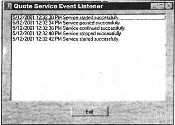 Создание приемника событийТеперь было бы полезно создать приложение, которое получает событие, когда в службе происходит что-то плохое. Мы создадим простое оконное приложение, отслеживающее события службы Quote: Оконное приложение имеет только окно списка и кнопку выхода: Компонент EventLogдобавляется в этот проект перетаскиванием его из панели инструментов. Свойство Logзадается как Application, a Sourceкак источник службы QuoteService. Класс EventLogтакже имеет свойство EnableRaisingEvents. До сих пор мы не говорили об этом свойстве. По умолчанию для него используется значение false, задание его как true означает, что событие создается каждый раз, когда происходит это событие, и можно написать обработчик событий для оконного события EntryWritten. В файле EventListener.csсвойства задаются в методе InitializeComponent(): private void InitializeComponent() { this.eventLogQuote = new System.Diagnostics.EventLog(); this.buttonExit = new System.Windows.Forms.Button(); this.listBoxEvents = new System.Windows.Forms.ListBox(); ((System.ComponentModel.ISupportInitialize) (this.eventLogQuote)).BeginInit(); this.SuspendLayout(); // // eventLogQuote // this.eventLogQuote.EnableRaisingEvents = true; this.eventLogQuote.Log = "Application"; this.eventLogQuote.Source = "QuoteService"; this.eventLogQuote.SynchronizingObject = this; this.eventLogQuote.EntryWritten += new System.Diagnostics.EntryWrittenEventHandler(this.OnEntryWritten); // ... Программа обработки OnEntryWritten()получает объект EntryWrittenEventArgsв качестве аргумента, где можно получить всю информацию из события. С помощью свойства Entryмы получаем объект EventLogEntryс информацией о времени, источнике события, типе, категории и т. д.: protected void OnEntryWritten(object sender, System.Diagnostics.EntryWrittenEventArgs e) { DateTime time = e.Entry.TimeGenerated; string message = e.Entry.Message; listBoxEvents.Items.Add(time + " " + message); } Выполняющееся приложение показывает все события для QuoteService: Мониторинг производительностиМониторинг производительности может использоваться для получения информации о нормальном выполнении службы. Это прекрасный инструмент, который помогает понять нагрузку системы и наблюдать изменения и тенденции. Windows 2000 имеет множество объектов производительности, таких как System, Memory, Objects, Process, Processor, Thread, Cacheи т. д. Каждый из этих объектов имеет множество показателей для мониторинга. С помощью объекта Process для всех процессов или для определенных экземпляров процессов можно контролировать время пользователя, счетчик дескрипторов. Ошибки страниц, счетчик потоков выполнения и т. д. В некоторых приложениях также имеются специфические объекты, например SQL Server. Для нашей службы цитат может представлять интерес получение информации о числе клиентских запросов, размере данных, посылаемых по каналам связи, и т.д. Классы мониторинга производительностиПространство имен System.Diagnosticsимеет следующие классы для мониторинга производительности: □ PerformanceCounterиспользуется как для мониторинга счетчиков, так и для записи счетчиков. С помощью этого класса можно создавать новые категории производительности. □ С помощью класса PerformanceCounterCategoryможно пройти через все существующие категории, а также создать новые. Программным путем получаются все счетчики категории. □ Класс PerformanceCounterInstallerиспользуется для установки счетчиков производительности, аналогично классу EventLogInstaller, о котором упоминалось ранее. Построитель счетчиков производительностиМожно создать новую категорию, выбирая счетчики производительности в Server Explorer. Категория называется Quote Service. В таблице показаны все счетчики производительности нашей службы: