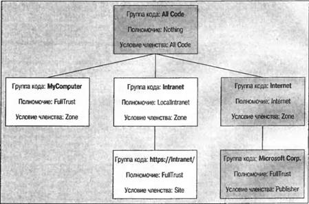 Полномочия идентичности не могут включаться в множества полномочий, так как CLR является единственным уполномоченным, который может предоставить коду права идентичности. Например, если фрагмент кода принадлежит определенному издателю, то мало смысла со стороны администратора предоставлять ему полномочия идентичности, связанные с другим издателем. CLR дает права, если необходимо, а мы может затем при желании их использовать. Просмотр полномочий сборкиПредположим, что используется приложение, написанное компанией Microsoft, и мы пытаемся использовать свойство, которое раньше не использовалось. Приложение не имеет копии кода, хранящейся локально, поэтому оно запрашивает ее, и код загружается в глобальный кэш сборок. При таком сценарии для кода из Интернета, опубликованного указанной организацией, подписавшей сборку с помощью сертификата, мы обнаружим, что членство группы кода сборки выглядит примерно так: Согласно политике в этом примере, группы кода All Code и Internet предоставляют только ограниченные полномочия, а членство группы кода в правом нижнем углу предоставляет сборке полномочие FullTrust. Права всех групп кода объединяются в создании общего эффективного полномочия самого высокого уровня. Таким образом, каждая группа кода, к которой принадлежит сборка, вносит дополнительные полномочия. Кроме групп кода, к которым принадлежит сборка, мы можем наблюдать полномочия, присвоенные группам кода, а также полномочия идентичности кода, которые дают нам доступ к свидетельству, представленному кодом во время выполнения. Чтобы увидеть полномочия для групп кода сборки, используется команда: caspol.exe -resolveperm assembly.dll Проверим это на сборке и визуально оценим предоставленные ей полномочия идентичности и доступа к коду, когда мы получаем к ней доступ через локальную интранет. Если мы введем следующую команду, то увидим полномочия доступа к коду и затем в конце три полномочия идентичности: caspol.exe -resolveperm http://intranet/assembly.dll Microsoft (R) .NET Framework CasPol 1.0.xxxx.x Copyright (c) Microsoft Corp 1999-2001. All rights reserved. Resolving permissions for level = Enterprise Resolving permissions for level = Machine Resolving permissions for level = User Grant = <PermissionSet class="System.Security.PermissionSet" version="1"> <IPermission class="System.Security.Permissions.EnvironmentPermission, mscorlib, Version=1.0.xxxx.x, Culture=neutral, PublicKeyToken=b77a5c561934e089" version="1" Read="USERNAME;TEMP;TMP" /> <IPermission class ="System.Security.Permissions.FileDialogPermission, mscorlib, Version=1.0.xxxx.x, Culture=neutral, PublicKeyToken=b77a5c561934e089" version="1" Unrestricted="true" /> <IPermission class="System.Security.Permissions.IsolatedStorageFilePermission, mscorlib Version=1.0.xxxx.x, Culture=neutral, PublicKeyToken=b77a5c561934e089" version="1" Allowed="AssemblyIsolationByUser" UserQuota="9223372036854775807" Expiry = "9223372036854775807" Permanent="True" /> <IPermission class="System.Security.Permissions.ReflectionPermission, mscorlib, Version=1.0.xxxx.x, Culture=neutral, PublicKeyToken=b77a5c561934e089" version="1" Flags="ReflectionEmit" /> <IPermission class="System.Security.Permissions.SecurityPermission, mscorlib, Version=1.0.xxxx.x, Culture=neutral, PublicKeyToken=b77a5c561934e089" version="1" Flags="Assertion, Execution, RemotingConfiguration" /> <IPermission class="System.Security.Permissions.UIPermission, mscorlib, Version=1.0.xxxx.x, Culture=neutral, PublicKeyToken=b77a5c561934e089" version="1" Unrestricted="true" /> <IPermission class="System.Net.WebPermission, System, Version=1.0.xxxx.x, Culture=neutral, PublicKeyToken=b77a5c561934e089" version="1"> <ConnectAccess> <URI uri="(https|http)://intranet/.*"/> </ConnectAccess> </IPermission> <IPermission class="System.Net.DnsPermission, System, Version=1.0.xxxx.x, Culture=neutral, PublicKeyToken=b77a5c561934e089" version="1" Unrestricted="true"/> <IPermission class="System.Drawing.Printing.PrintingPermission, System.Drawing, Version=1.0.xxxx.x, Culture=neutral, PublicKeyToken=b03f5f7f11d50a3a" version="1" Level="DefaultPrinting" /> <IPermission сlass="System.Diagnostics.EventLogPermission, System, Version=1.0.xxxx.x, Culture=neutral, PublicKeyToken=b77a5c561934e089" version="1"> <Machine name="." access="Instrument" /> </IPermission> <IPermission class="System.Security.Permissions.SiteIdentityPermission, mscorlib, Version=1.0.xxxx.x, Culture=neutral, PublicKeyToken=b77