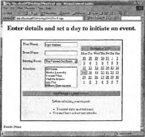 Пример серверного элемента управленияТеперь мы разберем простой пример — пришло время взглянуть на более сложный сценарий. Давайте создадим каркас приложения Web — утилиту для заказа помещения для собраний. В данный момент он будет содержать только внешний интерфейс и простую обработку событий, позже мы расширим его с помощью ADO.NET и связывания данных, чтобы включить серверную бизнес-логику. Форма Web, которую мы собираемся создать, будет содержать поля для имени пользователя, имени события, помещения для собраний и служителей вместе с календарем для выбора даты (предполагается в этом примере, что события продолжаются в течение полного дня). Используем элементы управления проверкой для всех полей, за исключением календаря, который будет проверяться на сервере и предоставлять дату по умолчанию в случае, если ничего не было введено. Для тестирования интерфейса пользователя мы будем также иметь на форме элемент управления Label, который можно использовать для вывода представляемых результатов. Вначале создадим в Visual Studio новый проект приложения Web с именем PCSWebApp2. Затем мы создаем форму, которая генерируется с помощью следующего кода в WebForm1.aspx(код, генерируемый автоматически, не выделен): <%@ Page language="c#" Codebehind="WebForm1.aspx.cs" AutoEventWireup="false" Inherits="PCSWebApp2.WebForm1" %> <html> <head> <meta content=False name=vs_showGrid> <meta content="Internet Explorer 5.0" name="vs_targetSchema> <meta content="Microsoft Visual Studio 7.0" name=GENERATOR> <meta content=C# name=CODE_LANGUAGE> </head> <body> <form method="post" runat="server"> <h1 align="center">Enter details and set a day to initiate an event.</h1> <br> <table borderColor="#000000" cellSpacing="0" cellPadding="8" rules="none" align="center" bgColor="#fff99e" border="2" width="540"> <tr> <td vAlign="top">Your Name:</td> <td vAlign="top"> <asp:textbox id="nameBox" runat="server" width="160px" /> <asp:requiredfieldvalidator id=validateName Runat="server" errormessage="You must enter a name." ControlToValidate="nameBox" display="None" /> </td> <td vAlign="center" rowSpan="4" > <asp:calendar id="calendar" runat="server" BackColor="White" /> </td> </tr> <tr> <td vAlign="top">Event Name:</td> <td vAlign="top"> <asp:textbox id="eventBox" runat="server" width="160px" /> <asp:requiredfieldvalidator id="validateEvent" Runat="server" errormessage="You must enter an event name." ControlToValidate="eventBox" display="None" /> </td> </tr> <tr> <td vAlign="top">Meeting Room:</td> <td vAlign="top"> <asp:dropdownlistid="roomList" runat="server" width="160px"> <asp:ListItem Value="1">The Happy Room</asp:ListItem> <asp:ListItem Value="2">The Angry Room</asp:ListItem> <asp:ListItem Value="3">The Depressing Room</aspListItem> <asp:ListItem Value="4">The Funked Out Room</asp:ListItem> </asp:dropdownlist> <asp:requiredfieldvalidator id="validateRoom" Runat="server" errormessage="You must select a room." ControlToValidate="roomList" display="None" /> </td> </tr> <tr> <td vAlign= " top">Attendees: </td> <td vAlign="top"> <asp:listbox id="attendeeList" runat="server" width="60px" selectionmode="Multiple" rows="6"> <asp:ListItem Value="1">Bill Gates</asp:ListItem> <asp:ListItem Value="2">Monika Lewinsky</asp:ListItem> <asp:ListItem Value="3">Vincent Price</asp:ListItem> <asp:ListItem Value="4">Vlad the Impaler</asp:ListItem> <asp:ListItem Value="5">Iggy Pop</asp:ListItem> <asp:Listltem Value="6">William Shakespeare</asp:ListItem> </asp:listbox> <asp:requiredfieldvalidator id="validateAttendees" Runat="server" errormessage="You must have at least one attendee." ControlToValidate="attendeeList" display="None" /> </td> </tr> <tr> <td align="middle" colSpan="3"> <asp:button id="submitButton" runat="server" width="100%" Text="Submit meeting room request" /> </td> </tr> <tr> <td align="middle" colSpan="3"> <asp:validationsummary id="validationSummary" Runat="server" headertext="Before submitting your request:" /> </td> </tr> </table> <br> Results: <asp:Label Runat="server" ID="resultLabel" Text="None." /> </form> </body> </html> После заголовка страницы, который записан между тегами HTML <h1>, чтобы сделать его крупным текстом в стиле заголовка, основное тело формы помещается между тегами HTML <table>. Мы могли бы использовать управляющий элемент таблицы сервера Web, но это внесло бы ненужную сложность, так как таблица используется только для форматирования вывода, а не как динамический элемент интерфейса пользователя. Таблица делится на три столбца, первый из которых содержит простые текстовые метки, второй содержит поля интерфейса пользователя, соотв