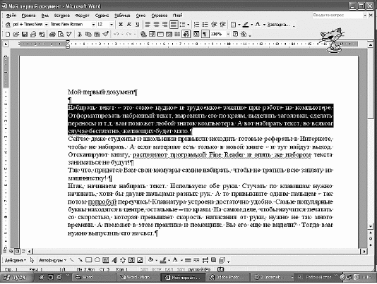 2) щелчок на соответствующей картинке на панели инструментов; 3) нажав специальное сочетание клавиш. Набор текстаПечатать текст – это, наверное, самое нудное и трудоемкое занятие при работе на компьютере. Отформатировать (придать лоск), выровнять по краям, выделить заголовки, сделать переносы и т. д. вам поможет любой знаток компьютера. А вот набирать текст, во всяком случае бесплатно, желающих будет мало. Сейчас студенты и школьники привыкли находить готовые рефераты в Интернете, чтобы не набирать. А если материал есть только в новой книге – и тут найдут выход. Отсканируют книгу, распознают программой Fine Reader и опять же набором текста заниматься не будут! Так что придется вам свои мемуары самим набирать, чтобы не тратить всю зарплату на машинистку! Итак, приготовились, сели в исходное положение. Начинаем набирать текст. Используем обе руки, не сачкуем. Стучать по клавишам нужно начинать хотя бы двумя пальцами разных рук. А то привыкните одним пальцем – потом попробуй переучись! Клавиатура устроена достаточно удобно. Самые популярные буквы находятся в центре, остальные – по краям. На самом деле, чтобы научиться печатать со скоростью, которая превышает скорость написания от руки, нужно не так много времени. А помогут в этом практика и помощник. Вы его еще не видели? То гд а вам нужно выпустить его на свет божий. ПомощникВ меню Справка выбираете строчку Показать помощника. В меню Справка нажимаем строку Показать помощника