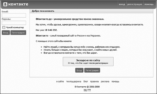 Также вы можете послать сообщения своим «друзьям». Ну, как же без сообщений, какой смысл искать людей, если потом с ними не общаться? А для особо общительных есть возможность создавать группы и вступать в группы по интересам. На страничках групп есть форумы (о форумах мы уже рассказывали ранее). В общем, в ближайшие ...дцать дней вам будет чем заняться. Удачи вам в поиске своих друзей и знакомых. «Вконтакте»Сайт www.vkontakte.ru – это тоже социальная сеть, аналогичная «Одноклассникам». Порой бывает очень сложно общаться лично или по телефону, особенно если вы живете в разных городах, а то и странах. Благодаря этому сайту миллионы людей находят старых и новых знакомых, общаются с ними и назначают встречи. Некоторые ищут на сайте друзей, и довольно часто безобидные встречи перерастают в бурные романы, а то и в серьезные отношения с штампом в паспорте и совместным воспитанием детей. Стартовая страница www.vkontakte.ru