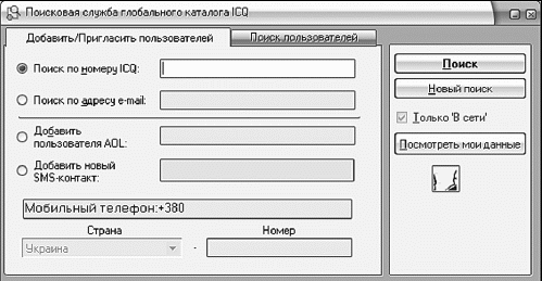 Окно глобальной поисковой службы ICQ, вкладка Добавить/Пригласить пользователей Окно с личными данными