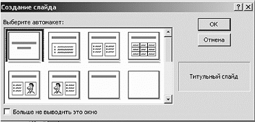 Но так как мы уже достаточно знаем компьютер и не боимся его, то будем делать презентацию сами. Для этого выбираем в закладке Общие строку Новая презентация и нажимаем на кнопку ОК. На экране появится окно Выбор слайда. В окне показаны разнообразные варианты расположения информации на слайде. Слайдом в нашем случае будет называться страница презентации. Теперь остается выбрать, какой вид слайда нас устроит. Окошко выбора слайда