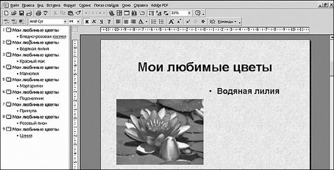 Как мы уже говорили, презентация у нас будет называться «Мои любимые цветы». Название презентации внесем в поле заголовка слайда. А в качестве текста слайда у нас будут названия цветов. А в качестве картинки – фотографии цветов. Чтобы ввести текст, нужно щелкнуть левой кнопкой мыши по соответствующему полю и ввести с клавиатуры текст. Вставка фотографии осуществляется из командной строки программы. Выбираем команду Вставка, далее Рисунок и далее Из файла. В появившемся окне Добавить рисунок находим место на компьютере, где у нас лежат фотографии, выбираем фотографию и нажимаем кнопку Вставить. Появившуюся на мониторе фотографию нужно с помощью мышки перетащить в соответствующее поле. При этом фотография будет автоматически масштабирована, в зависимости от размеров поля для фотографии. Итак, вводим текст и вставляем картинку. При этом рабочее поле у нас примет следующий вид. Внешний вид рабочего поля
