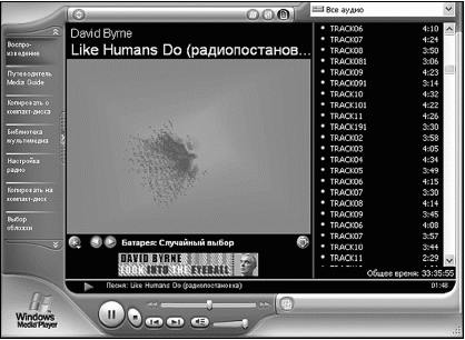 В левой части окна проигрывателя Windows Media находится панель задач. Она содержит семь кнопок, связанных с функциями проигрывателя. С функциями мы разберемся чуть позже. А пока, если панель задач вам мешает, можно ее убрать – щелкните по кнопке с галочкой справа на панели задач. В центре окна находится окошко с картинкой зрительного образа и названием записи, которая проигрывается в данный момент. Справа в окне находится список воспроизведения, в котором находятся не сами файлы, а только ссылки на их названия. Если вам мешает этот список, то щелкните на кнопке (D, которая находится над названием проигрываемой песни, и он исчезнет с ваших глаз долой. Над списком воспроизведения находится раскрывающийся список, из которого можно выбирать, что слушать. Панель задач и кнопка Скрыть панель задач