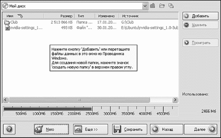 Выберите папку и файлы, которые будут записаны на диск. После того как данные для записи будут выбраны, нажмите кнопку Добавить. При этом данные будут появляться в окне программы NERO. Так можно собирать данные из разных папок на один диск. Как только выбор будет закончен, нажмите кнопку Завершен. Окно проводника закроется, а в поле программы будет список из выбранных файлов и папок. На этом этапе можете внимательно просмотреть, не добавили ли чего лишнего для записи. В этом случае выберите все ненужное и нажмите кнопку Удалить. Также в поле программы отобразится, насколько будет заполнен записанный диск и объем записываемой информации. Здесь же можно сохранить образ диска и больше не лазить по компьютеру, собирая файлы из различных папок. Для этого нажимаем кнопку Сохранить. Теперь у нас все содержимое диска умещается в одном файле. И при необходимости запустить запись данного диска можно из главного окна программы NERO Express легким нажатием одной кнопки. Но мы снова немного отвлеклись. Вот у нас выбрана информация для записи, и нас все устраивает. Тогда для продолжения записи нажимаем кнопку Далее. И переходим в следующее окно. Выбираем привод, на который будет записываться диск