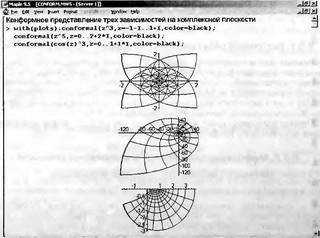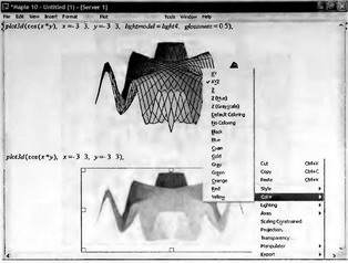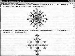 Глава 8Визуализация вычислений Эта глава книги посвящена уникальным возможностям системы Maple 9.5/10 в визуализации самых разнообразных вычислений. Рассмотрены возможности и опции двумерной и трехмерной графики, в том числе использующей функциональную окраску. Особое внимание уделено визуализации математических и физических понятий и реализации различных возможностей машинной графики. 8.1. Двумерная графика8.1.1. Введение в двумерную графикуСредства для построения графиков в большинстве языков программирования принято считать графическими процедурами или операторами. Однако в СКМ Maple 9.5/10 мы сохраним за ними наименование функций, в силу двух принципиально важных свойств: • графические средства Maple возвращают некоторые графические объекты, которые размешаются в окне документа — в строке вывода или в отдельном графическом объекте; • эти объекты можно использовать в качестве значений переменных, то есть переменным можно присваивать значения графических объектов и выполнять над ними соответствующие операции (например, с помощью функции snow выводить на экран несколько графиков). Графические функции заданы таким образом, что обеспечивают построение типовых графиков без какой-либо особой подготовки. Для этого нужно лишь указать функцию, график которой строится, и пределы изменения независимых переменных. Однако с помощью дополнительных необязательных параметров (опций) можно существенно изменить вид графиков — например, настроить стиль и цвет линий, вывести титульную надпись, изменить вид координатных осей и т.д. В Maple введены функции быстрого построения графиков. Так, функция smartplot(f) предназначена для создания двумерных графиков. Параметр f может задаваться в виде одиночного выражения или набора выражений, разделяемых запятыми. Задание управляющих параметров в этих графических функциях не предусмотрено; таким образом, их можно считать первичными или черновыми. Для функции построения двумерного графика по умолчанию задан диапазон изменения аргумента -8..8. 8.1.2. Функция plot для построения двумерных графиковДля построения двумерных графиков служит функция plot. Она задается в виде plot(f, h, v) plot(f, h, v, o) где f — визуализируемая функция (или функции), h — переменная с указанием области ее изменения, v — необязательная переменная с указанием области изменения, о — параметр или набор параметров, задающих стиль построения графика (толщину и цвет кривых, тип кривых, метки на них и т.д.). Самыми простыми формами задания этой функции являются следующие: • plot(f,xmin..xmax) — построение графика функции f, заданной только своим именем в интервале изменения х от xmin до xmax; • plot(f(x),x=xmin..xmax) — построение графика функции f(x) в интервале изменения х от xmin до xmax. Выше приводилось множество примеров применения этой функции. Для нее возможны следующие дополнительные параметры: • adaptive — включение адаптивного алгоритма построения графиков (детали см. ниже); • axes — вывод различных типов координат (axes=NORMAL — обычные оси, выводятся по умолчанию, axes=BOXES — график заключается в рамку с осями-шкалами, axes=FRAME — оси в виде перекрещенных линий, axes=NONE — оси не выводятся); • axesfont — задание шрифтов для подписи делений на координатных осях (см. также параметр font); • color — задает цвет кривых (см. далее); • coords — задание типа координатной системы (см. далее); • discont — задает построе
