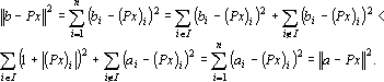 Обозначим через — линейное пространство, натянутое на множество эталонов. Тогда первое преобразование в (5) переводит векторы из Rn в L({xi}). Второе преобразование в (5) переводит результат первого преобразования Px в одну из вершин гиперкуба образов. Легко показать, что второе преобразование в (5) переводит точку Px в ближайшую вершину гиперкуба. Действительно, пусть a и b две различные вершины гиперкуба такие, что a — ближайшая к Px, а b = x'. Из того, что a и b различны следует, что существует множество индексов, в которых координаты векторов a и b различны. Обозначим это множество через I = {i : ai = -bi}. Из второго преобразования в (5) и того, что b = x', следует, что знаки координат вектора Px всегда совпадают со знаками соответствующих координат вектора b. Учитывая различие знаков i-х координат векторов a и Px при i ∈ I можно записать |ai-(Px)i| = |ai|+|(Px)i| = 1+|(Px)i|. Совпадение знаков i-х координат векторов b и Px при i ∈ I позволяет записать следующее неравенство |bi-(Px)i| = ||bi|-|(Px)i| < 1+|(Px)i|. Сравним расстояния от вершин a и b до точки Px Полученное неравенство Ортогональные сетиДля обеспечения правильного воспроизведения эталонов вне зависимости от степени их коррелированности достаточно потребовать, чтобы первое преобразование в (5) было таким, что xi = Pxi [67]. Очевидно, что если проектор является ортогональным, то это требование выполняется, поскольку x = Px при x ∈L({xi}), а xj ∈L({xi}) по определению множества L({xi}). Для обеспечения ортогональности проектора воспользуемся дуальным множеством векторов. Множество векторов V({xi}) называется дуальным к множеству векторов {xi}, если все векторы этого множества vj удовлетворяют следующим требованиям: 1. (xi, vi) = ςij; ςij = 0, при i ≠ j; ςij = 1 при i = j; 2. vj ∈L({xi}). Преобразование является ортогональным проектором на линейное пространство L({xi}). Ортогональная сеть ассоциативной памяти преобразует образы по формуле