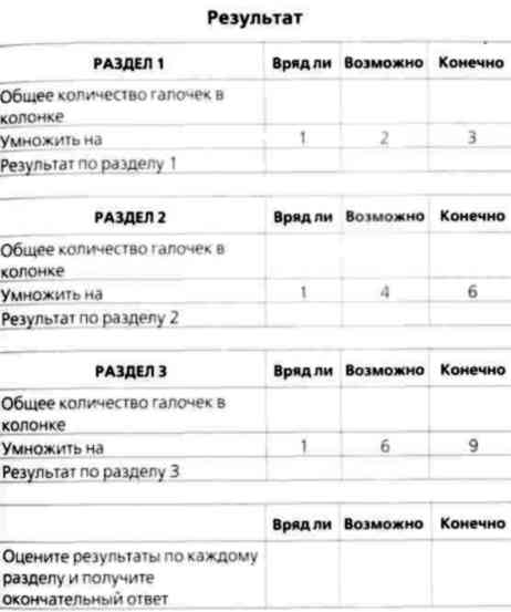 Глава 7 КАК НАЙТИ ПОДХОДЯЩЕГО ПАРТНЕРА - ОЦЕНКА ПАРТНЕРСКИХ КАЧЕСТВ КАК НАЧИНАЮТСЯ БОЛЬШИНСТВО ОТНОШЕНИЙ У большинства из нас отношения начинаются случайно. Хотя все больше людей знакомится через брачные агентства и через Интернет, около половины из нас находит партнеров на работе, а остальные знакомятся случайно в клубах, пабах, барах, на дискотеках, в гостях и на свиданиях вслепую. Большая часть людей находит партнеров неожиданно, без каких-либо планов и четких целей. И после этого мы удивляемся, почему количество разводов так велико. Любой отдел кадров, подбирая кандидата на должность руководителя высокого уровня, требует от претендентов резюме, медицинскую справку, финансовые документы, кредитную историю и рекомендации с предыдущих мест работы. Если человек был в тюрьме или совершил массовое убийство, вам же нужно об этом знать, верно? Так почему же вы вступаете в личные отношения с человеком, которого встретили в клубе или пабе и о котором ничего не знаете? Однако большинство из нас знакомится с новыми партнерами абсолютно случайно. В течение первого года знакомства люди всеми силами стараются скрыть свои недостатки и подчеркнуть достоинства, так что довольно долго вы не имеете представления о том, что за человек рядом с вами. Идеальный партнер для вас — тот, относительно кого у вас нет абсолютно никаких сомнений в том, что именно с этим человеком вы хотите провести всю жизнь. Не спешите. Возраст больше не играет серьезной роли. Вам есть из кого выбирать. Любые отношения — это процесс "Я решил жениться на ней. Ухаживание — это пустая формальность. Но что сказать, чтобы познакомиться? "Хочешь жевательную резинку?" — слишком просто. "Эй, малышка" — слишком фамильярно для моей будущей невесты. "Я люблю тебя! Я с ума схожу от страсти!" — слишком прямолинейно. "Я хочу, чтобы ты стала матерью моих детей" — слишком преждевременно. И я ничего не сказал. Именно ничего. Я просто сидел и ничего не делал. Автобус подъехал к ее остановке, она сошла, и я больше никогда ее не видел". Когда речь заходит о выборе партнера на длительный срок, здравый смысл гораздо полезнее эмоций и чувств. Как мы уже говорили, любовь связана с химическими процессами, происходящими в мозгу и направленными на то, чтобы подтолкнуть вас к размножению, не раздумывая над тем, подходит ли вам этот человек. Любые решения, которые могут изменить вашу жизнь, следует принимать взвешенно. Подумайте, хорошо ли вам будет рядом с этим человеком в течение долгого времени. Неудачный союз будет иметь серьезные последствия и сделает вашу жизнь несчастливой. Лучший способ поиска партнера на всю жизнь — это тот, каким ищут кандидатов на высокие должности. Зачем позволять незнакомцу менять вашу жизнь и самому меняться только из-за того, что в организме произошел выброс гормонов? СОВПАДЕНИЕ С ПОДХОДЯЩИМ ПАРТНЕРОМЧтобы найти подходящего партнера, вы должны: — точно знать, чего вы хотите от партнера; - иметь возможность дать ему то, чего он хочет от вас. Как мы уже знаем, первобытным женщинам нужны были средства. И мужчины на протяжении веков развивались как добытчики этих средств. Первобытные мужчины ценили в женщинах репродуктивную способность, и поэтому женщины на протяжении веков стремились выглядеть молодыми, здоровыми и плодовитыми. Сознательно или подсознательно, мужчины и женщи