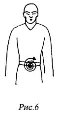 Большой Небесный круговорот (рис. 15). Прежде чем переходить к изучению Большого Небесного круговорота необходимо достаточно хорошо усвоить методику Малого Небесного круговорота, прозанимавшись им не менее 5–6 месяцев. Положение для занятий: — Сидя в позиции Лотос, Полулотос, по-турецки, — Сидя на стуле, — Стоя. Тип дыхания — обратный абдоминальный. Цикл дыхания должен быть более долгим, чем при занятии Малым Небесным круговоротом. Выполните выдох. Язык опускается к десне нижней челюсти. Ци опускается в нижний Даньтянь, а затем в точку Хуэйинь. После этого Ци разделяется на два потока и опускается по внутренней стороне ног в точку Юнцюань, расположенную в центре стоп. Начните выполнять вдох. Язык поднимается к верхнему нёбу. Потоки Ци проходят по внешней стороне ног через точку Хуаньтяо, расположенную на головке бедренной кости и соединяются в точке Хуэйинь. По заднесерединному меридиану Думай Ци проходит через «Три заставы» и достигает точки Байхуэй. Далее Ци вновь разделяется на два потока, которые огибают глазные впадины с внешней стороны, проходят по обеим сторонам головы и направляются к точке Цюэцяо. Выполните выдох. Ци от точки Цюэцяо по переднесерединному меридиану Женьмай опускается в нижний Даньтянь и далее в точку Хуэйинь. Цикл Большого Небесного круговорота завершен. Искусство круговорота по непарным меридианам (рис. 16–18). Данное упражнение как правило практикуют после качественного овладения Большим Небесным круговоротом. Основной целью данной методики является налаживание циркуляции Ци во всех каналах за счет циркуляции энергии по Большому и Малому Небесному кругу. Здесь речь идет о восьми дополнительных меридианах: Думай, Нэньмай, Чунмай, Даймай, Янцяо, Иньцяо, Янвэй, Иньвэй. Тип дыхания — обратный абдоминальный. Положение тела — любая из основных позиций. Сосредоточьте внимание на точке Хуэйинь, затем поднимите Ци по заднесерединному меридиану Думай в точку Байхуэй, затем по каналу Женьмай через три Даньтяня верните в точку Хуэйинь. Таким образом вы выполнили движение Ци по Малому Небесному кругу. Далее на вдохе поднимите Ци к меридиану Даймай, проходящему по пояснице. Ци разделяется на два потока и поднимается к плечам. На выдохе опустите Ци по меридианам Янцяо по внешней стороне рук в средние пальцы (рис. 16). Ци огибает средние пальцы и поступает в точку Лаогун, расположенную в середине ладони. Датее Ци поднимается по внутренней стороне рук и следует по каналу Иньвэй, направляясь в средний Даньтянь. Оба потока Ци соединяются в среднем Даньтяне, пересекают меридиан Даймай и возвращаются в точку Хуэйинь (рис. 17). Сделайте вдох. Поднимите Ци из точки Хуэйинь вверх по каналу Чунмай в средний Даньтянь. На выдохе опустите Ци в нижний Даньтянь, а затем по меридианам Иньцяо далее в точки Юнцюань. Сделайте вдох. Поднимите Ци по меридианам Янцяо вверх, оба потока соединяются в точке Минмэнь. Затем по каналу Думай Ци поднимается в точку Байхуэй. Сделайте выдох. Опустите Ци по каналу Жэньмай в нижний Даньтянь, и далее в точку Хуэйинь (рис. 18). Описанное выше составляет один цикл упражнения, насчитывающий 4 вдоха-выдоха. Во время тренировки необходимо сделать не меньше чем 10 таких циклов, на продвинутых этапах занятий — 24 цикла.