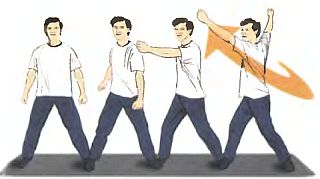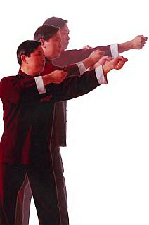 Каллиграфия двух рифмованных двустиший, приведенных во введении к четвертой части Оригинальная каллиграфия этих двух рифмованных двустиший воспроизведена выше. Эти два свитка были составлены, написаны от руки и переданы мне в качестве подарка одним из личных телохранителей доктора Сунь Ятсена, основателя современного Китая, ставшего первым президентом страны. Эти двустишия содержат главный совет любому, кто хочет заняться боевыми искусствами. В наши дни во многих местах традиции боевых искусств понимаются неправильно и сводятся всего лишь к комплексу ударов и боевых движений. Конечно, непобедимость опытного мастера боевых искусств хорошо известна. Но эта сила происходит не из приемов нападения. Источник истинной силы обнаруживается в этих строчках, написанных телохранителем доктора Сунь Ятсена. Строка «Сердце генерала» указывает на качества опытного руководителя: открытость ума, щедрость и способность работать с людьми, понимать и побуждать их к действию. «Ум Конфуция» обозначает углубленное изучение, мудрость и знание. Смысл данной строки не сводится к характеристике идей лишь этого философа, но относится ко всем, кто посвятил себя делу глубокого познания. «Отвага героя» рождается из бесстрашия, сущности человеческой свободы. «Сострадание Будды» распускается подобно цветку из открытого сердца и разума, огромного, как сама вселенная. Понимание этих четырех качеств особенно важно на данной ступени тренировок, так как четвертая часть книги раскрывает перед вами боевой аспект применения вашей силы. Вы будете изучать движения «пяти энергий» и тренироваться в их выполнении, согласно традиции дачэн-цюань. Но вы серьезно ошибаетесь, если думаете, что предметом вашего обучения будут насилие и ярость. «При наличии глубоких знаний, писал Великий Мастер Ван Сянчжай, — это поможет вам сформировать ваш характер, воспитать в вас преданность и добросовестность, чувство справедливости, доброжелательности и отваги». Самое главное в этой учебе, говорил он, это не победа или поражение, а достижение «успокоения, роста вашей силы и привнесение в вашу жизнь интереса». Обучая своих исследователей, Великий Мастер Ван говорил, что его искусство невозможно понять только через призму научных объяснений. Он подчеркивал, что оно должно быть воспринято непосредственно через практику. «Объяснению поддается лишь механика силы; то, что не поддается объяснению, находится в вашем сердце», — говорил он. Те, кто восхищался Великим Мастером Ваном, называли его систему Великим Свершением: ведь вместо того, чтобы учить их определенному набору движений, он передавал им сущность проявляющейся человеческой силы. Это давало его студентам большую свободу, позволяя им двигаться удивительно разнообразно, не будучи стесненными постоянным копированием мертвых форм. Пять движений, описанных ниже, отражают традиционную китайскую систему «пяти энергий». Это пять основных направлений, в которых движется энергия. Говорят, что пять энергий управляют всеми естественными природными циклами, такими, как времена года, и находят свое выражение в силах природы. Именно эти силы Великий Мастер Ван Сянчжай научился высвобождать в своем искусстве дачэн-цюань. Полный мах Для выполнения пяти движений дачэн-цюань, описанных в этой части, вам надо работать над высво