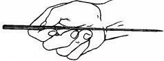 Способы держания ножа в руке Памятуя, что в предыдущей главе мы обозначили четыре близких дистанции, сразу же хочу сказать, что поражать мишень и противника с этих дистанций надо, держа нож за рукоятку. Нож держится в руке таким образом: лезвие направлено в сторону стенда или противника, рукоятка находится в ладони, четыре пальца удерживают рукоятку снизу, являясь как бы направляющей дорожкой для вылета ножа из руки. Большой палец, с обязательно согнутой под углом 45о фалангой, лежащей на ноже, никогда не должен выходить за линию согнутого указательного пальца и плоско лежать на ноже (рис. 10). Никто из авторов работ по метанию ножа не сказал об этом ни слова. Что дает такой способ держания ножа? Правильно положенный на рукоятку, да и на лезвие (это мы разберем чуть позже), ![]() ![]() Рис. 10 большой палец руки дает возможность правильно прицельно метнуть нож. От положения пальца на ноже зависит, начнет ли кувыркаться нож в броске или нет. Точно так же большой палец играет важную роль, попадет ли нож в цель горизонтально или вертикально. Я нигде не встречал, чтобы этот момент был бы кем-либо затронут и освещен. Большой палец как бы подкручивает нож при отпускании из руки, направляя в точк3у, горизонтально или вертикально. Но, правда, может быть, это секреты мастеров. За лезвие нож держится точно так же с учетом того, что одна сторона его острая и должна несколько миллиметров выглядывать из ладони наружу. Метая нож за рукоятку с дистанции до 2 м, это делается одним взмахом руки. Нож, никуда и никак не переворачиваясь, входит в мишень. Но, начиная с 2 м, нож удобней метать за лезвие, и вот тут при отпуске ножа из руки следует как бы слегка подсечь лезвие снизу вверх согнутым указательным пальцем. Тогда нож, сделав всего пол-оборота, жалом воткнется в мишень. ![]() Рис. 11 ![]() Рис. 12 Надо помнить правило, что, метая нож за лезвие с 2 м или 12 м, нож должен сделать всего лишь пол-оборота (рис. 11). Метая нож за рукоятку с 5 м и далее, нож должен сделать полный оборот (рис. 12). Когда ученик, держа за лезвие, начинает пробовать дистанцию 5,5-6 м, то нож буквально по несколько миллиметров должен уходить в ладонь, но в этих случаях все равно ладонью должно быть захвачено не более половины рукоятки. Нож надо держать не сильно или крепко, а плотно зажав его пальцами указанными хватом. Очень важным обстоятельством является положение кисти при броске ножа, в самой его конечной фазе отпускания (рис. 13) ![]() Рис. 13 На рис. 14 показан вариант правильного и неправильного положения кисти. ![]() ![]() Рис. 14 При правильном положении кисти как бы наносит удар, а нож по диагонали, где-то под углом 45о смотрит вверх, при неправильном положении кисть завалена вниз, и обычно нож начинает кувыркать, и попадает в землю. При метании ножа рука должна быть абсолютно расслаблена. И только в конце, при отпускания ножа, она, как бы останавливаясь, имитирует удар. Глаза ученика смотрят в ту точку, куда он хочет попасть, наблюдая за своей рукой нижним или боковым периферическим зрением, направляя и останавливая свою руку там, куда смотрят его глаза. Классическим примером из всех перечисленных действий является дистанция 3 м, когда ученик, держа нож за лезвие, слегка большим пальцем касаясь рукоятки и не вылезая своим большим пальцем за зону согнутого указательного пальца, посылает нож в цель (рис.15). ![]() Рис. 15 Такая манер