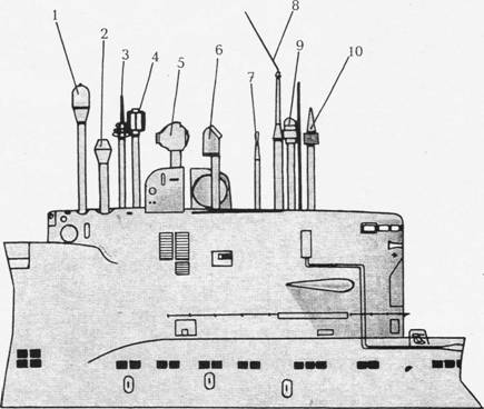АПКР пр. 667Б и пр. 667БД: 1 – АП СОРС «Залив-П»; 2 – ПМУ РДП; 3 – ПМУ «Анис» (за ним находится ПМУ с АП РАК «Каскад»); 4 – АП радиопеленгатора «Завеса-П»; 5 – ПМУ радиосекстана «Сайга»; 6 – перископ астрокорректора «Волна»; 7 – перископ ПЗНГ-8М; 8 – ПМУ «Ива-МВ»; 9 – перископ МТ-70-8; 10 – ПМУ «Синтез» системы космической навигации.