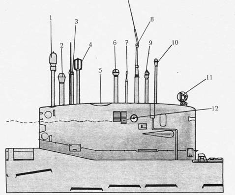 АПКР пр. 667А: 1- АП СОРС «Залив-П»; 2 – ПМУ РДП; 3 – АП РАК «Альбатрос»; 1 – АП радиопеленгатора «Завеса-П»; 5 – ПМУ ВАН-С; б – перископ ПР-14; 7 – перископ ПЗНГ-8М; 8 – ПМУ «Ива-М»; 9 – перископ МТ-70-8; 10 – перископ ПЗНС-8; 11 – пеленгатор и секстан на кардановом подвесе.