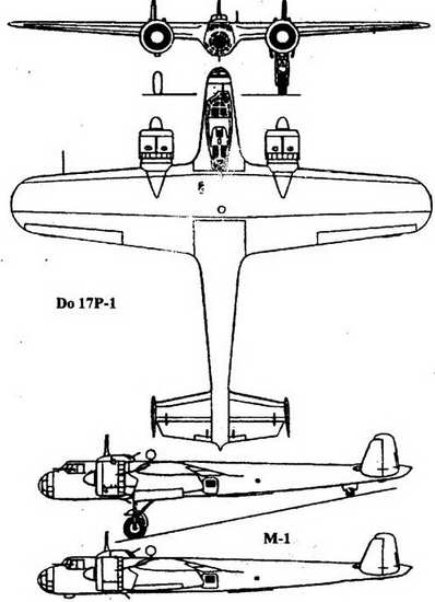 Дорнье Do 17 В середине 30-х годов во французское и британское авиационные министерства стали просачиваться слухи об очень быстром Schulterdecker-kampfflugzeug - бомбарди-ровщике-верхнеплане, якобы, более быстром, чем существующие истребители. Подтверждением существования такого самолета стала демонстрация в Бюкеберге в октябре 1935 г одного из опытных самолетов. Но только в июле 1937 г, когда Do 17V8, участвуя в международном соревновании военных самолетов в Цюрихе, выиграл гонку "Круг Альп", обставив все истребители, стало ясно, что такой самолет действительно удалось создать. Бомбардировщик имел такой тонкий профиль, что тут же был окрещен "летающим карандашом". Его демонстрация в Цюрихе имела значительный международный резонанс. А вот то, что не было известно в Цюрихе, так это факт в общем то случайного превращения Do 17 в бомбардировщик. Еще не было известно, что опытный самолет, демонстрировавшийся в Цюрихе, был специально "вылизан" и имел значительно более мощную двигательную установку, чем на серийных моделях, поставлявшихся люфтваффе. "Цюрихский" самолет представлял собой чисто демонстрационный образец с максимальной скоростью большей на 90 км/ч по сравнению с серийным бомбардировщиком. Do 17 был создан тогда, когда в Германии теория воздушной войны отводила истребителям вторстепенную роль, отдавая первенство скоростным бомбардировщикам, способным уйти от перехвата. И хотя эту теорию нужно еще было доказать, она возродилась с появлением Do 17, обозначившего склонность немцев к относительно небольшим, мощным, с высокой нагрузкой на крыло, но многоцелевым самолетам этого типа. Немцы придерживались такой концепции на протяжение всей войны. Наиболее замечательной особенностью истории создания Do 17 было то, что в отличие от Не 111, с самого начала проектируемого в качестве бомбардировщика, самолет Дорнье разрабатывался исключительно, как коммерческий самолет! Для использования в европейской "экспресс службе" "Люфтганза" заказала высокоскоростной почтовый самолет, способный везти почту и шесть пассажиров. По этим требованиям Дорнье спроектировал самолет, использующий самые последние достижения аэродинамики и самые мощные немецкие двигатели - BMW VI мощностью на взлете в 660 л. с. Наиболее характерной особенностью проекта был чрезвычайно вытянутый профиль фюзеляжа, увенчанный не менее длинным носом. Do 17 имел "весьма" худой профиль, но зато его центропланная часть была, тем не менее, очень широкой. Передняя секция фюзеляжа из овальной формы переходила в перевернутый треугольник в два раза более широкий сверху в центральной секции фюзеляжа. Затем фюзеляж вновь переходил к овальной форме сечения. Фюзеляж набирался из шпангоутов, соединенных швеллерами стрингеров и был обшит листами из легкого сплава. Крыло имело двухлонжеронную конструкцию с частично металлической и частично тканевой обшивкой. Лонжероны представляли собой несимметричный профиль из тонкого дюраля. Основные нервюры собирались из дюралевых швеллеров, а дополнительные - имели трубчатый каркас. Тканевая обшивка использовалась между лонжеронами на нижней поверхности крыла. Щелевые закрылки шли от элеронов до фюзеляжа. Все топливо располагалось между лонжеронами центроплана у фюзеляжа. Главные стойки шасси убирались назад в гондолы двигателей. Заднее колесо также убиралось. Первы