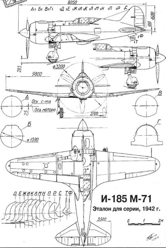 B-185 - СКОРОСТЬ, МАНЕВР, ОГОНЬ … ТРАГЕДИЯ Юрий Д. Гугля/ Киев Владимир П. Иванов/ Санкт-Петербург Чертежи разработал Ю.А. Гугля Фото из личных архивов авторов В «АХ» 1994 была помещена монография «Роковой И-180». Ее авторы A.3. Гугля и В, Иванов более 20 лет посвятили изучению поликарповской темы. Сегодня мы публикуем их статью, которая подробно рассказывает об истребителе И-185, И-185М-71 (1941 г.) В октябре 1939 г, Поликарпов в составе делегации авиапрома отправился а Германию. В ходе этой поездки специалисты из СССР получили возможность ознакомиться с последними достижениями немецкой авиапромышленности. Увиденное убедило Николая Николаевича в том, что внедрявшийся в серию И-180 отвечает требованиям времени, Однако выяснилось и то, что вскоре появятся более совершенные модификации Bf-109, а фирма «Фокке-Вульф» создала мощный истребитель FW-190. И если Яковлев, Лавочкин, Пашинин и другие в это время работали над самолетами, близкими BF109Е, то Поликарпов решил «наносить удар» с большим упреждением. Возвратившись в конце года из командировки, он внес предложение о постройке перспективного скоростного истребителя И-185. Однако после приезда пришлось заниматься не проектированием, а решением сложного организационного вопроса. Оказалось, в отсутствие Николая Николаевича на заводе №1, где размещалось его ОКБ, создали опытно-конструкторский отдел (ОКО) во главе с двумя его заместителями -А.И. Микояном и М.И. Гуревичем, Туда, кроме половины рядовых сотрудников, попали и многие ведущие специалисты: В.А. Ромодин, Н.И. Андрианов, Н.З. Матюк, А.Т. Карев, Д.Н. Кургузов и др. Переводили, как говорится, кого кнутом, кого пряником, Сомневающимся говорили; «Поликарпов - конченый человек, он же поп, крест носит, его все равно скоро расстреляют. Кто вас тогда защитит? А у Микояна брат наверху,.,- Новое КБ получило для использования и одну из последних разработок поликарповского коллектива - эскизный проект «К».На его основе вскоре был создан И-200 (МиГ-1), Это -мероприятие» фактически означало развал ОКБ Поликарпова, Вскоре оставшихся сотрудников вместе с главным конструктором перебазировали в бывшие производственные мастерские летного отдела ЦАГИ, которые получили громкое название -Авиационный завод №51-, Однако никакого завода не существовало, его предстояло только создать, наладить работу всех служб, набрать новый кострукторский коллектив… За последние 4 года ОКБ в четвертый раз (!) меняло свою прописку, Николая Николаевича назначили директором и главным конструктором нового предприятия. В этой должности он оставался до самой смерти. В сложных условиях, с вдвое меньшим составом сотрудников Поликарпов энергично принялся за создание И-185 (проект 62), Он хорошо представлял, каким должен быть истребитель в надвигавшейся войне. Как показало время, И-185 по своим параметрам отвечал требованиям 1945 г. Малочисленный коллектив параллельно с И-180 и И-185 занимался полуторапланами И-190 и И-195 М-90. Однако объясняется это отнюдь не «приверженностью Поликарпова к бипланам», как полагают отдельные авторы, а требованиями заказчика. Например, даже накануне войны в журнале «Техника Воздушного Флота» (№5-6, 1941) генерал-лейтенант М,П, Строев писал: «Развивая в любых направлениях варианты скоростного истребителя с Умах=700-800 км/ч и более, нужно одновременно строить и разрабатывать одноместный маневренный и
