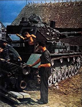 Средний танк T-IV ![]() На этой поздней модификации T-IVno бортам установлены специальные экраны, увеличивающие защиту от противотанковых средств противника. Танки T-IV выпускались в течение всей Второй мировой войны и составили основу вооружения немецких танковых дивизий. В 1934 году управление вооружений вермахта заказало разработку танка (для секретности ему дали обозначение «средний трактор»), которым было намечено вооружить каждую четвертую роту танковых батальонов. В конкурсе приняли участие фирмы «Рейнме- талл», «Крупп» и MAN, которые представили свои прототипы - VK 2001 (Rh), VK 2001 (К) и VK 2002 (MAN) соответственно. Конкурс выиграл вариант компании «Крупп», и вскоре на заводе в Магдебурге началось серийное производство машин, получивших обозначение T-IV Ausf A, SdKfz 161, или машина командира батальона Конструкция В то время, когда создавался T-IV, основные средние по классу, но сравнительно легкие по массе танки не могли нести пушки с высокой начальной скоростью полета снаряда. Поэтому первоначально главной задачей новой машины было оказание огневой поддержки таким танкам. Основным вооружением T-IV была пушка L/24 калибра 75 мм с длиной ствола 24 калибра. Дополнительное вооружение включало спаренный и курсовой 7,92-мм пулеметы. Место механика-водителя располагалось в передней левой части корпуса, справа от него размещался стрелок-радист. В башне располагались три члена экипажа - командир в центре, за казенной частью орудия, слева от казенника было место наводчика, справа - заряжающего. Моторно-трансмиссионное отделение размещалось в кормовой части корпуса, ручная коробка имела шесть передач вперед и одну назад. Боекомплект пушки -122 снаряда, пулеметов - 3000 патронов. Максимальная толщина брони корпуса составляла 20 мм, башни - 14,5 мм. Производство Темпы выпуска наращивались постепенно. Так, если танков первой модификации А было произведено лишь 35, то модели T-IVB было выпущено 45 единиц, С - 134, а D - 229. С 1938 года начался серийный выпуск модификации Е. Машина получила дополнительную броневую защиту, масса возросла с 17 до 21 т, был установлен новый двигатель мощностью 320 л.с. После падения Франции появилась модификация F, масса которой возросла на тонну, были установлены широкие гусеницы, снижавшие удельное давление на грунт. Несмотря на то что T-IV оставался в производстве много лет, его шасси практически не претерпело изменений. Модернизация сводилась главным образом к усилению бронирования и огневой мощи. В отличие от многих других моделей того времени, конструкция танка позволяла неоднократно внедрять усовершенствования. Последние версии T-IV существенно отличались от прототипа. Так, в танке модели F2 толщина лобовой брони корпуса достигала 60 мм, башни - 50 мм. Основное вооружение включало длинноствольную 75-мм пушку L/43 с дульным тормозом, которая применяла кумулятивные, осколочно-фу- гасные, бронебойные и дымовые снаряды. Модификацию Н вооружили пушкой L/48, которая не уступала 76- мм орудию советского танка Т-34. Последней машиной семейства T-IV стала модификация J, производство которой началось в марте 1944 года. Всего было выпущено около 9000 танков всех модификаций. На шасси этого танка были созданы многочисленные специальные машины, в том числе истребители танков, зенитные САУ, самоходные орудия, БРЭМ и танковые мостоукладчики. ![]() Вверху. Замена двигателя танка в полевы