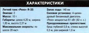 Легкий танк «Рено» R-35 Танк непосредственной поддержки пехоты R-35 был создан в традициях Первой мировой войны и исходя из ошибочных представлений, что танковая война мало изменилась с 1918 года. В начале 30-х годов сухопутные войска Франции разработали требования к новому танку поддержки пехоты, который заменил бы стоявшие на вооружении еще со времен Первой мировой войны танки «Рено» FT-17. В результате в 1934 году был создан прототип, получивший обозначение ZM. Испытания начались в 1935 году, но, не дожидаясь их окончания, в связи с растущей угрозой со стороны фашистской Германии было принято решение запустить этот танк в производство. Машина получила обозначение легкий танк «Рено» R-35. Перед самым началом производства по предложению штаба сухопутных войск бронирование танка было усилено с 30 до 40 мм. К 1940 году было построено более 1600 машин, R-35 стал самым массовым французским танком поддержки пехоты. По своей компоновке он напоминал FT-17, то есть это был легкий танк с экипажем из двух человек. В конструкции широко применялась литая броня, а в качестве упругих элементов подвески использовались резиновые амортизаторы-рессоры. Механик-водитель располагался в передней части корпуса, а в цельнолитой башне находился командир танка, который также вел огонь из 37-мм пушки L/21 (впоследствии замененной на L/33 того же калибра с более длинным стволом) и спаренного с ней 7,5-мм пулемета. Боекомплект составлял 100 снарядов для пушки и 2400 патронов к пулемету. Обзор из башни был явно недостаточным, а компоновка боевого отделения была такова, что большую часть времени в бою командиру приходилось проводить стоя на полу корпуса. Задняя часть башни была сконструирована как откидная крышка, на которой командир мог сидеть на марше. Танк R-35 вполне соответствовал своей эпохе и был классическим представителем французского дизайна танков. В 1940 году была создана модификация АМХ R-40 с усовершенствованной подвеской, но до оккупации Франции немецкими войсками было построено только несколько таких машин. Небольшой R-35 не смог достойно сражаться с немецкими танками. Пушка танка R-35 оказалась малоэффективной даже против легких немецких танков, хотя 40-мм броня надежно защищала от снарядов противотанковых орудий немцев. Таким образом, R-35 не смогли оказать существенной поддержки своим войскам. Большое количество танков R-35 попало к немцам практически неповрежденными. Небольшими группами они вошли в пехотные дивизии вермахта, дислоцированные во Франции, и получили обозначение PzKpfw 35-R(f). Впоследствии большинство из них были переданы в учебные танковые подразделения. После вторжения в СССР со многих R-35 были сняты башни для переоборудования в артиллерийские тягачи и транспортеры боеприпасов Munitionpanzer 35-R(f). Башни были сняты также и с тех танков R-35, которые остались на территории Франции, после чего на их шасси было создано несколько типов самоходных артиллерийских установок, получивших обозначение 4.7-ст Pak(t) auf GW 35-R(f) Башни же использовались при сооружении оборонительной системы «Атлантический вал». Таким образом, танки R-35 вошли в историю в большей степени на службе в германской армии, чем французской. ![]() Созданный на базе неверной концепции тактического боя, танк R-35 оказался непригодным для ведения боевых действий. Колонна танков R-35 на марше, командиры расположились на откидн