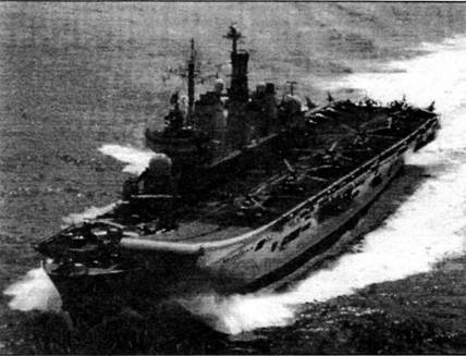 Легкий авианосец "Инвинсибл» В США на смену старым авианосцам приходили новые, всегда превосходившие предшественников по размерам и, само-собой, по стоимости. Великобритания не могла позволить себе роскошь строить «супер Арк Ройал». На рубеже 60-70-х годов в военно-политических кругах страны развернулась дискуссия о будущем корабельной авиации ВМС. Чаша весов склонялась к полному отказу от палубных самолетов и замены их вертолетами Уэстленд/Сикорский «Си Кинг» с базированием их на кораблях класса эсминец. Программа разработки самолета вертикального взлета и посадки «Кестрел»/«Харриер» многим представлялась чересчур рискованной. Заложенный 20 июля 1973 г. на верфи фирмы Виккерс в Бэрроу легкий авианесущий корабль «Инвинсибл» стандартным водоизмещением 19 500 т, первоначально (на стадии проекта) предполагалось вооружить вертолетами, но еще до его закладки, в 1972 г., в состав палубной авиагруппы было решено ввести палубный вариант СВВП [1*] Хоукер Сиддли «Харриер». Испытательные полеты СВВП с различных кораблей проводились с 1963 г., когда опытный «Кестрел» совершал полеты с палубы авианосца «Арк Ройал». В мае 1971 г. на нем в рамках программы летных испытаний базировались уже четыре «Харриера». «Инвинсибл» сошел на воду в мае 1977 г., в июле 1980 г. вступил в строй. В процессе постройки проект неоднократно подвергался корректировкам. При вертикальном взлете самолет несет очень небольшую полезную нагрузку; чтобы ее увеличить, англичане изучали возможность взлета с коротким разбегом, а капитан- лейтенант Тейлор в 1972 г. предложил идею взлета с использованием трамплина. Проверка и отработка взлета СВВП с использованием трамплина проводились в 1977-1979 гг. Реализация идей Тейлора позволила увеличить боевую нагрузку «Харриера» на 800 кг. По результатам испытаний «Инвинсибл» был оборудован трамплином с углом установки 7°. Пока авианесущий крейсер достраивался, морской этап испытаний проводили на авианосце «Гермес», для чего его оснастили 12-градусным трамплином с обтекателем на лобовой стенке. Всего построили три легких авианосца: R04 «Инвинсибл», R06 «Илла- стриес» (заложен на верфи фирмы Сван Хантер в Уэллсенде в октябре 1976 г., спущен на воду в декабре 1978 г., вошел в строй в июне 1982 г.) и R07 «Арк Ройал» (заложен в Уэллсенде в декабре 1978 г., спущен на воду в июне 1981 г., вошел в строй в ноябре 1985 г.). Основным назначением этих кораблей должна была стать охота за подводными лодками. «Инвинсибл» положил начало новому классу авианесущих кораблей – носителей СВВП. По вступлении в строй он не произвел особого впечатления на военно-морские круги мира: и сам авианосец, что называется, и близко не смотрелся рядом с плавучими аэродромами США, и самолеты, базировавшиеся на нем, вызывали, мягко говоря, неоднозначные оценки. Проект «Инвинсибла» был результатом компромисса очень различных точек зрения. Точку над «і» поставили военные действия в Южной Атлантике во время англо-аргентинского конфликта 1982 г. «Инвинсибл» и ветеран «Гермес» составили ядро английской эскадры, посланной отвоевывать Фолклендские острова. Хотя типовой состав авиакрыла «Инвинсибла» включал пять самолетов и девять вертолетов, во время боевых действий на его борту базировалось десять «Харриеров» и девять вертолетов. Еще восемнадцать СВВП находилось на авианосце «Гермес». Палубные самолеты смо