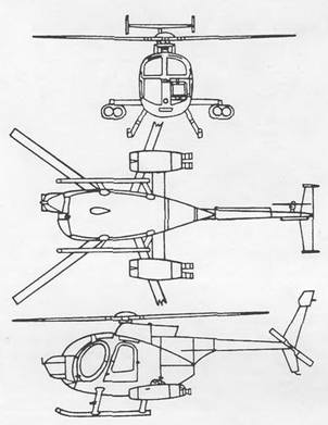 McDonnell Douglas 500 Defender Макдоннелл-Дуглас 500 «Дефендер» МНОГОЦЕЛЕВОЙ ВЕРТОЛЕТ Предназначен для огневой поддержки сухопутных войск, выполнения разведывательных операций и специальных заданий. Является развитием серии вертолетов ОН-6 «Хьюз» 500. После того как фирма «Макдоннелл-Дуглас» приобрела компанию «Хьюз Геликоптере», вертолет получил обозначение Модель 500. Под этим обозначением выпускались следующие модификации. 500D «Toy Дефендер» – легкий противотанковый вертолет; может нести 4 ПТУР «Тоу»; снабжен прицелом в носовой части фюзеляжа 500D (первоначально OH-6D «Супер Скаут») – легкий разведывательный вертолет; снабжен ГТД Ал- лисон 250-С20В мощностью 317 кВт/425 л.с., пятилопастным несущим винтом и Т-образным оперением; отличался увеличенной грузоподъемностью и большей взлетной массой; предлагался по программе усовершенствованного разведывательного вертолета ASH. Совершил первый полет в 1974 г., серийно производился в США в 1975-1983 гг., а также по лицензии в Аргентине, Италии, Южной Корее и Японии. 500MD «Скаут Дефендер» – легкий многоцелевой и противотанковый вертолет; снабжен пилонами для установки ПТУР, НАР или пулеметов в контейнерах. 500MD/ASW «Дефендер» – противолодочный вертолет, может быть вооружен одной или двумя противолодочными торпедами Мк.46 и нести магнитометр. 500MG «Дефендер» – легкий многоцелевой вертолет для полиции, патрульной и спасательной службы, борьбы с перевозкой наркотиков. Используется в качестве боевого (АН-6С, G, F nj), многоцелевого (МН-6Е, В, С, Н) и для электронной разведки (ЕН-6В и Е) в группах специального назначения армии США; 20 вертолетов поставлено ВВС Филиппин и 4 – ВВС Колумбии. 500MG «Найтфокс» – вариант 500MG с системой ночного видения FLIR. MD 530F «Лифтер» – гражданский вариант с удлиненной носовой частью и ГТД Аллисон 250-C30 взлетной мощностью 317кВт/425л.с. Диаметр несущего винта увеличен на 0,3 м, рулевого – на 0,05 м. Вертолет снабжен грузовым крюком, рассчитанным на усилие 907 кг. Первый полет совершен в 1982 г. Поставки начаты в 1984 г. Всего поставлено 109 гражданских вертолетов Модель 500/530, кроме того, – 26 вертолетов Ираку. 530MG «Дефендер» – многоцелевой и боевой вертолет, предназначенный для борьбы с бронетанковой техникой и разведки. В январе 1984 г., когда компания «Хьюз Геликоптере» стала дочерней компанией «Макдоннелл-Дуглас», была продолжена разработка военных и гражданских вариантов Модели 500, которая остается в производстве под обозначением 500Е и 530 «Лифтер» (оптимизированный вариант для перевозки грузов). 530MG «Дефендер» разработан на основе серийного вертолета 530F «Лифтер» и выполнен по одновинтовой схеме, с пулевым винтом, одним двигателем и лыжным шасси. Фюзеляж типа полумонокок каплеобразной формы, изготовлен из алюминиевых сплавов. В передней части кабины расположены сиденья летчика и стрелка (или наблюдателя), в задней части 2- 4 сиденья для пассажиров. Возможна перевозка до 7 человек при установке 4 сидений в задней кабине или двоих носилок по бокам фюзеляжа (в санитарном варианте), а также перевозка грузов до 900 кг. В задней части кабины имеются 14 узлов крепления грузов, под задними сиденьями – багажный отсек. Под полом кабины в передней части расположен отсек радиоэлектронного оборудования, в задней части – топливные баки. Хвостовое оперение вертолета Т-образное, с вертикальными шайбами на концах стабилизатора. Несущий вин