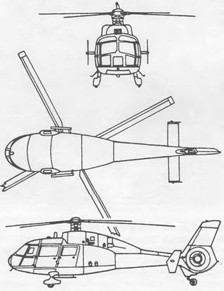 Aerospatiale SA 365 dauphin 2 Аэроспасьяль SA 365 «Дофин» 2 МНОГОЦЕЛЕВОЙ ВЕРТОЛЕТ Предназначен для непосредственной поддержки войск на поле боя, а также для транспортировки десантников, раненых или груза и проведения поисково-спасательных операций. Компания «Аэроспасьяль» в 1972 г. начала разработку многоцелевого вертолета «Дофин» для замены «Алуэтт» III в двух версиях: с одним и двумя двигателями. Первым был вертолет SA 360. В мае 1973 г. он установил три рекорда скорости среди вертолетов своего класса. Второй опытный экземпляр поднялся в воздух 29 января 1973 г., а в декабре 1975 г. получил сертификат соответствия нормам летной годности Франции Первый прототип вертолета с двумя двигателями SA 365 «Дофин» совершил полет 24 января 1975 г SA 360 – опытный экземпляр, оснащенный ТВД Турбомека Астазу XVI мощностью 730 кВт/980 л.с. на валу. Первый полет состоялся 2 июня 1972 г. Позднее этот вертолет был оборудован двигателем Астазу XVII А мощностью на валу 783 кВт/1050 л.с. SA 360 «Дофин» – первая серийная версия с ТВД Астазу XVIIIA. Вертолет вмещал пилота и 9 пассажиров. Варианты внутренней или внешней полезной нагрузки насчитывали 1420 или 1300 кг. Максимальная крейсерская скорость на уровне моря 275 км/ч, начальная скороподъемность 540 м/мин, статический потолок с учетом влияния земли 3850 м, дальность 680 км, вес пустого вертолета 1580 кг, максимальный взлетный вес 3000 кг. Его размеры составляли: диаметр несущего винта 11,50 м, длина фюзеляжа 10,98 м, высота 3,50 м. SA 361Н «Дофин» – создан на базе SA 360, но имел втулку несущего винта Старфлекс и ТВД Астазу ХХВ мощностью на валу 1043 кВт/1400 л,с. Как штурмовой вертолет он мог перевозить 13 полностью экипированных солдат. В качестве боевого вертолет SA 361Н оснащался кассетной пусковой установкой с трубчатыми направляющими для восьми ПТУР класса «Хот», наводимых на цель гиростабилизированным прицелом SFIM АРХ М397, установленным на крыше, системой ночного видения SFIM «Венус», размещенной в носовой части и включающей в себя систему теплового изображения TRT «Гектор» На базе SA 360 «Дофин» в 1985 г создан вертолет SA 365 «Дофин» 2, который выпускался в следующих модификациях (отличались лишь оборудованием): SA 365FM – вертолет для ВМС; AS 365К «Пантера» – французский боевой вертолет для непосредственной поддержки войск, вооруженный 20-мм пушкой, контейнерами с НАР калибра 70 мм и УР «Мистраль»; SA 365N – военно-транспортный вертолет, лицензионное производство которого было налажено в Китае под обозначением Z-9; SA 365NI – палубный поисковый и спасательный вертолет, с поисковой РЛС, спасательной лебедкой и автопилотом (совершил первый полет 2 июля 1982 г.); SA 366G – вертолет Национальной гвардии (НН- 65А «Дофин»), поставлявшийся также ВС Израиля; AS 565МА «Пантера» – военно-транспортный вертолет; AS 565SA «Пантера» – противотанковый вертолет. Вертолет SA 365 «Дофин» 2 выполнен по одновинтовой схеме, с рулевым винтом типа «фенестрон», двумя газотурбинными двигателями и трехопорным убирающимся шасси. Фюзеляж цельнометаллический, типа полумонокок, отличается хорошими аэродинамическими формами. Двухместная кабина экипажа имеет металлический каркас с большим остеклением в верхней части. На вертолете осуществлено бронирование сидений летчиков, элементов системы управления полетом и системы управления двигателем, защита фюзеляжа от удара при вертикальных посадочных скоростях до 7 м/с и максимальной взлетной ма