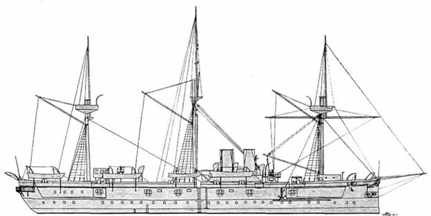 Глава 37. Появление защитной палубы"Шеннон"Строитель Заложен Спущен на воду Введён в строй Стоимость Пембрук 29.09. 1873 11.11.1875 17.09.1877 302707 ф. ст. Размерения, м 79,2x16,45x6,40/7,16 Водоизмещение, т 5390 (окончательно 5670), корпус и броня 3500, оборудование 1940 Вооружение 2 10" 18-тонных дульнозарядных нарезных, 7 9" 12-тонных дульнозарядных нарезных, 6 20-фунтовых 4 торпедных аппарата(1881) Броня, мм пояс 152-203-229, траверзы 203-229, боевая рубка 102-229, палубы 25-38-76, обшивка 32, подкладка 254-305 (тик) (общий вес бронирования 1060 т) Механизмы Горизонтальные компаунд возвратно-поступательного действия ("Лэрд"), 2 цилиндра высокого давления (диаметр 1118 мм), 2 цилиндра низкого давления (диаметр 2159 мм), ход поршня 1220 мм, Индикаторная мощность 3370 л.с, 12,25 уз. Один винт, диаметр 5944 мм, шаг 5500 – 6700 мм, 70 об/мин., Запас топлива, т 280/560 (уголь) Площадь парусов 2208 м2 (вооружённый как корабль), 1978 м2 (вооружённый как барк) Экипаж, чел. 452 "Шеннон" стал первым британским броненосным крейсером, первым кораблём с броневой палубой и бортовыми отсеками вместо полного пояса. Он оказался также последним кораблём Королевского флота с полной корабельной парусной оснасткой и с одним винтом. "Шеннон" не мог найти применения в первой линии, поскольку он был недостаточно защищен, чтобы выдержать эскадренный бой с броненосцами и недостаточно быстроходен для крейсерских операций. «Шеннон» В качестве боевого корабля "Шеннон" представляет весьма условный интерес, однако как образец конструктивного развития он примечателен тем, что оказался первым броненосным кораблём, на котором ввели защитную палубу и который возвели в ранг броненосного крейсера. Все эти качества позволили ему занять видное место в истории военного кораблестроения. В соответствии с изначальной классификацией его называли "крейсерским кораблём с броневым поясом и бортовой батареей" (broadside armour-belted cruising ship) со статусом линейного корабля 2-го ранга, так что в качестве такового он попадает в рамки настоящего повествования. Предназначавшийся для несения службы в далеких водах, где сам порядок пребывания подразумевал длительные морские переходы, этот корабль должен был нести значительные запасы при необходимом уровне вооружения и защиты для эффективного противостояния его иностранным современникам подобного же ранга. Однако никакие качества "Шеннона" не могли оправдать его использование в эскадре линкоров, для компании которых он совершенно не подходил. Как линейный корабль 2-го класса, он мог вести дуэль с подобными себе иностранными броненосцами, которые он мог с наибольшей вероятностью встретить за границей, – однако, когда возникла необходимость вернуться в воды метрополии, его безнадёжно малая скорость не давала ни малейшей возможности использовать его как крейсер, и никакого другого назначения, кроме как в качестве корабля береговой охраны, для него было невозможно придумать. В итоге изо всех 21 года службы в составе Королевского флота три он провёл на дальних станциях, 10 лет числился кораблем береговой охраны и около четырёх провёл в Резерве. Оставшиеся четыре года пришлись на различные ремонты и переоборудования. «Шеннон». Общий вид в 1881 г. Появление "Шеннона" было ответом на постройку русскими крейсера "Генерал-Адмирал" (заложен в 1870 г.). Этот корабль нёс четыре 8" и два 6" орудия в открытой центральной батарее и защищался по ватерлинии от штев