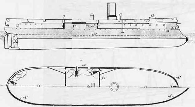 Глава 18. «Паллас» и «Беллерофон»«Паллас»Строитель Заложен Спущен на воду Введён в строй Стоимость "Паллас" Вулич 19.10.1863 14.03.1865 6.03.1866 190403 ф.ст. Размерения, м 68.58x15,24x5,79/7,41 Водоизмещение, т 3794 (корпус и броня 2440. оборудование 1350) Вооружение После вода в строй: 2 7" казнозарядпых Армстронга, 4 7" дульнозарядных нарезных. После перевооружения в 1866 г.: 2 7" казнозарядных Армстронга. 4 8" дульнозарядных нарезных, 2 5" казнозарядных Армстронга, После перевооружения в 1871 г.: 4 6" дульнозарядных нарезных, 4 8" дульнозарядных нарезных. Броня, мм пояс, батарея и траверзы 114, подкладка 560 (общий вес брони 560 т). Механизмы горизонтальные компаунд ("Хамфрейз энд Теннант"). два цилиндра высокого давления (диаметр 1295 мм), два цилиндра низкого давления (диаметр 2654 мм), индикаторная мощность 3580 л.с. 68 об/мин. 13 уз, четырёхлопастной винт Гриффита (диаметр 5410 мм. шаг 5829 мм). 4 коробчатых котла (давление 2,1 атм). Запас топлива, т 260 (уголь) Площадь парусов, м2 1553 "Экипаж, чел. 253 «Паллас» был первым британским кораблём, который был спроектирован главным образом как таран. Его отношение длины к ширине составляло 4,5:1, осадка кормой на 1,5-1,8 м превышала осадку носом. Он также стал первым боевым судном, оснащённым паровой машиной-компаунд. Броненосец «Паллас» «Паллас» примечателен ещё и тем, что стал одним из двух первых броненосных кораблей, построенных на королевских верфях по чертежам, отличающихся от чертежей, создаваемых в Адмиралтействе, и которые были подготовлены Ридом, как частным лицом. Чертежи были представлены Совету, когда услугами Рида впервые воспользовались в Отделе главного строителя. В свете реальной ценности этого корабля для флота, трудно представить, что этому, в чём-то жалкому, маленькому кораблю приписывали выдающиеся боевые качества и считали его воплощением определенных тактических требований, заполняющих промежуток между тем, что хотел Совет, и тем, что мог предоставить инспектор. Если и был корабль, испытавший на себе в большой мере восхваление до постройки и презрение после вступления в строй, проживший жизнь в извиняющейся покорности и испытавший преждевременный упадок, то это был корвет-таран Рида. Но рассматривая «Паллас» с тех позиций, с которых он был представлен Сомерсету, нет ничего удивительного, что он явил собой достойный похвалы маленький корабль. Короткий, и к тому же обещающий дать высокую по тем временам скорость 14 уз, хорошо защищенный и несущий немного орудий, имеющих широкие углы обстрела, что достигалось невиданным до тех пор методом устройства амбразур, а также снабжённый выдающимся далеко вперед в подводной части форштевнем, который можно было использовать как таран, в совокупности с хорошей маневренностью – этот корабль действительно представлял то «многое в малом», к чему так напрасно стремился Совет. Когда он был спроектирован, на флоте не было ничего аналогичного его пропорциям. В то время господствовало предупреждение в пользу большой длины. и предложение построить корабль длиной всего 68,6 м, который сможет идти под парами со скоростью 14 уз, было воспринято кораблестроителями с большим трудом. Парусная оснастка и орудийная мощь должны были стать дополнительными факторами к скорости под парами, а совершенно новая форма корпуса предполагала выполнение кораблём специальных функций тарана вместо обычных задач боевого корабля, д