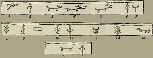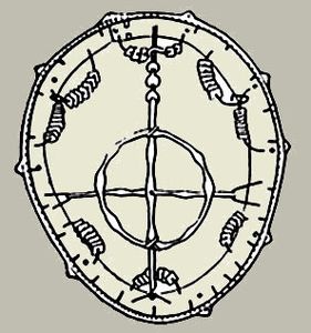 Шаманский бубен как модель вселенной Конструкция бубна Традиционные представления народов Сибири о пространстве и времени наиболее полно воплощены в шаманском бубне. Бубен — это не только музыкальный инструмент, но и универсальное выражение модели мира, карта мироздания. Особое значение придавалось и бубну в целом, и каждой его детали, будь то рисунок, подвеска, элемент конструкции или материал, из которого изготовлены отдельные его части. (Схема бубна : а — наружная сторона бубна; б — бубен сбоку; в — внутренняя сторона бубна. 1 — шкура, натянутая на обечайку, деревянный обруч круглой или овальной формы; 2 — обечайка; 3 — резонаторные “шишки”; 4 — место прикрепления шкуры к обечайке; 5 — свободная кромка шкуры; 6 — железные скобы с подвесками; 7 — крестовина (рукоять бубна); 8 — резонаторные щели в обечайке) Композиция рисунков Значение бубна как модели вселенной ярче всего проявляется в тех случаях, когда на внутреннюю или внешнюю стороны обтяжки и на обечайку нанесены рисунки. Обычно сама композиция разрисовки воспроизводила основные членения мироздания — его деление на верхний, средний и нижний миры. Кроме трехчастного деления по вертикали встречаются бубны, разделенные на четыре зоны, а также с концентрическим или плоскостным изображением миров. ( Бубны эвенков.) В каждом секторе рисунки ориентированы по вертикальной оси бубна, т.е. животные и птицы движутся снизу вверх. В левом верхнем секторе: лучистый круг - солнце, соединенное линией с лучистой звездой; луна в виде полумесяца; летящая птица; два оленя - самец (изображение с рогами) и самка (без рогов). В правом верхнем секторе изображены фигуры двух тигров - самца и самки. В левом нижнем секторе: пара оленей (самец и самка); культовое сооружение, состоящее из березовых жердей или деревьев, соединенных между собой поперечинами, и двух групп кольев по сторонам. В правом нижнем секторе нарисовано шесть летящих ос. Можно предположить, что первый из перечисленных секторов означает небесный мир, второй - мир горной тайги и ее обитателей, третий - мир людей, четвертый - подземный мир, из которого вылетают насекомые (хотя их изображения больше походят на птиц, в описи собирателя указано, что это "рой ос", а, согласно мифам многих сибирских народов, жалящие насекомые произошли из тела сожженной и низвергнутой в нижний мир ведьмы-людоедки). Илл. 6в. (Рисунок селькупского бубна) Этот рисунок был сделан селькупом Фомой Пеших по просьбе этнографа Е.Д.Прокофьевой в 1928 г. По всей видимости, он стремился не столько воспроизвести конкретную разрисовку бубна, сколько передать суммарный смысл наносимых на бубен изображений: правая его половина означала светлый (верхний, небесный, дневной), а левая - темный (нижний, подземный, ночной) миры; кроме того, в соответствии с традиционной для селькупских бубнов композицией небо занимает центральную, земля - среднюю, а подземный мир - крайнюю (примыкающую к обечайке) части поверхности бубна; на внутренней стороне обечайки селькупы также наносили рисунки (в исполнении Ф.Пеших они оказались изображенными на самом бубна). Этим же композиционным членениям соответствуют и нанесенные в соответствующих зонах изображения: в нижней правой ("светлой") части нарисованы олени, а в левой ("темной") - медведи; снизу справа - обычные человеческие фигуры, а слева - обитающие 
