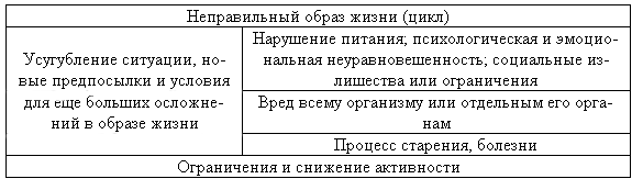 Неправильный образ жизни усугубляет имеющиеся у человека физиологические, эмоциональные, психологические и социальные проблемы, создает предпосылки для дальнейших ухудшений в состоянии человеческого организма и ускорения его старения. Это обусловливает появление новых проблем, отрицательно влияющих на изменения в образе жизни, что предопределяет неизбежность его дальнейшего ухудшения по отношению к молодости и здоровью человека.